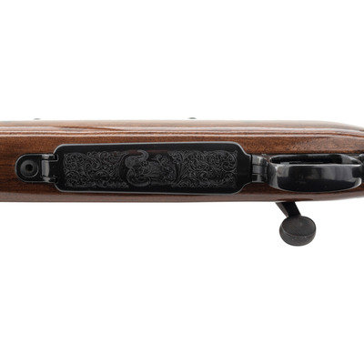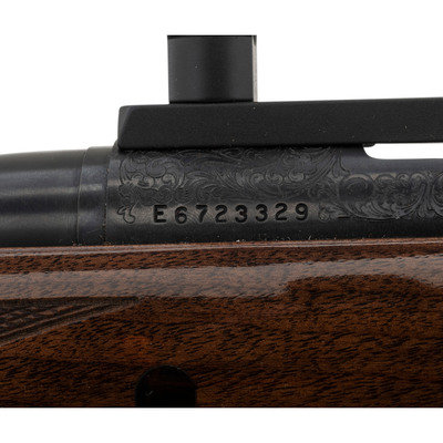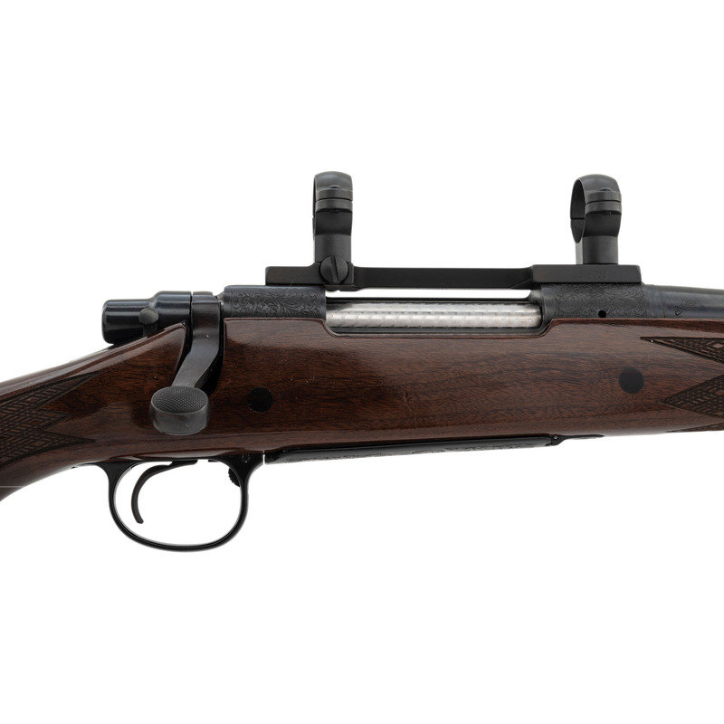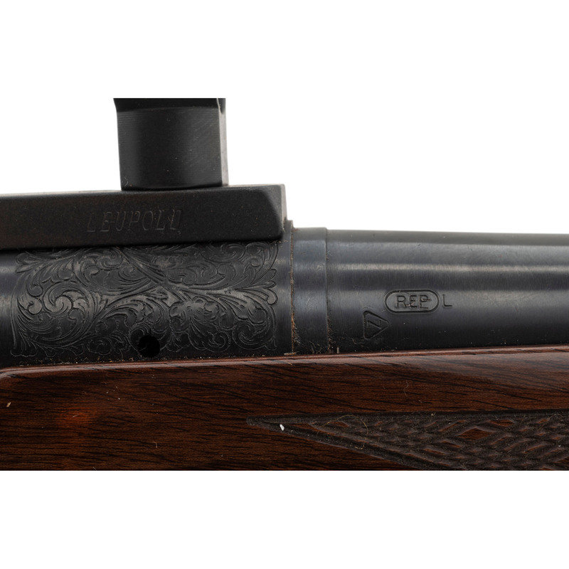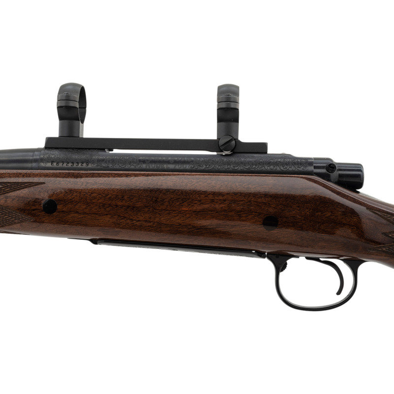 .375 Remington Ultra Magnum. 26" barrel length. SN: E6723329. Blued metal finish with fire blued bolt handle, jeweled bolt, and mounting walnut Monte-Carlo stock with skip line checkering and synthetic forend and pistol grip caps. Bolt-action repeating rifle fed by an internal box magazine. Item mounts a LEUPOLD marked one piece Redfield style scope base with two one inch rings. Sights consist of an adjustable rear notch with front bead sights. The receiver features floral scroll embellishments enclosing the model marking Remington/MODEL 711.
