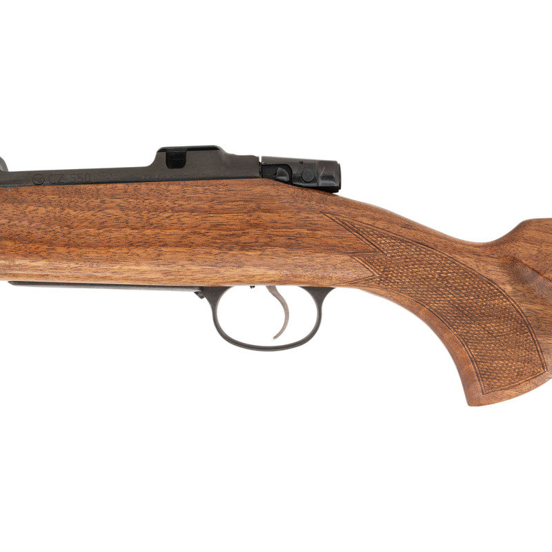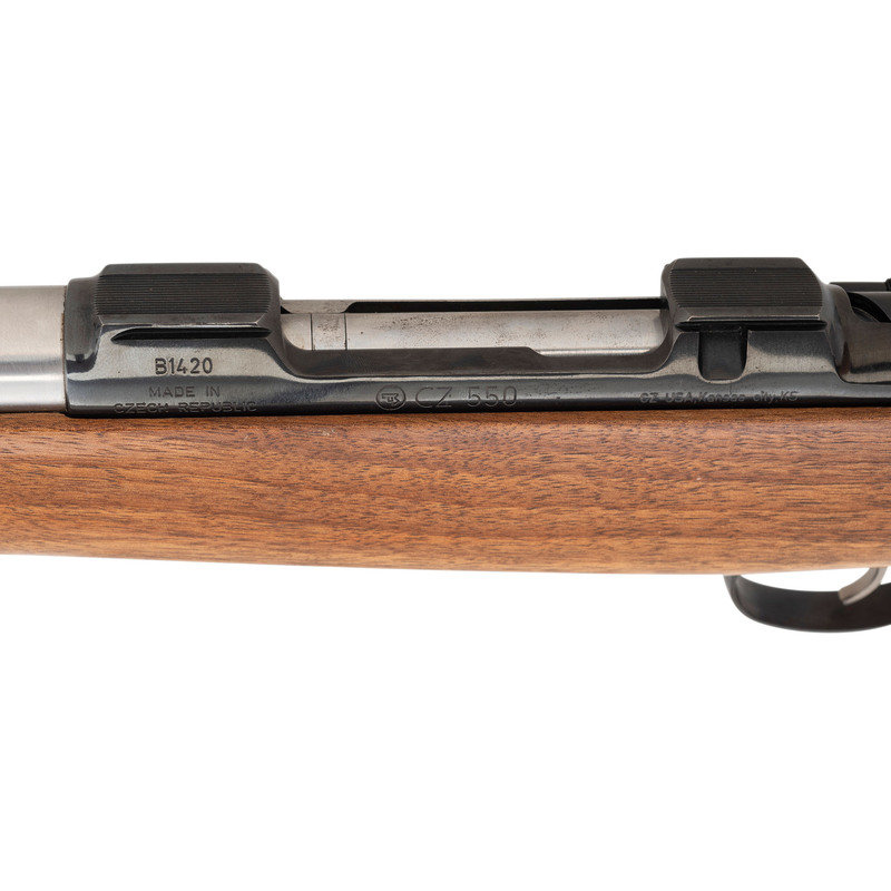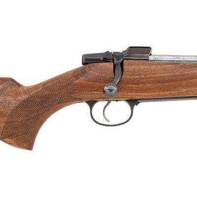 .375 caliber. 28" barrel length. SN: B1420. Stainless steel finish to barrel and blued finish to receiver and bolt handle. Walnut stock has a Roman nose-style comb with cheek rest, and checkering to semi pistol grip and forearm. Bolt action rifle with an internal box magazine and ported muzzle brake. Item features a vented rubber recoil pad and double sling studs. Barrel is marked 375D on left side.
