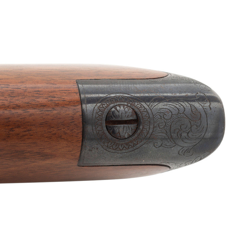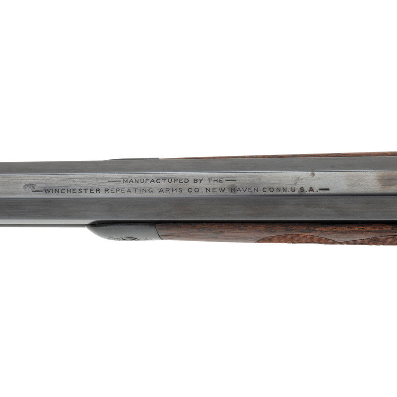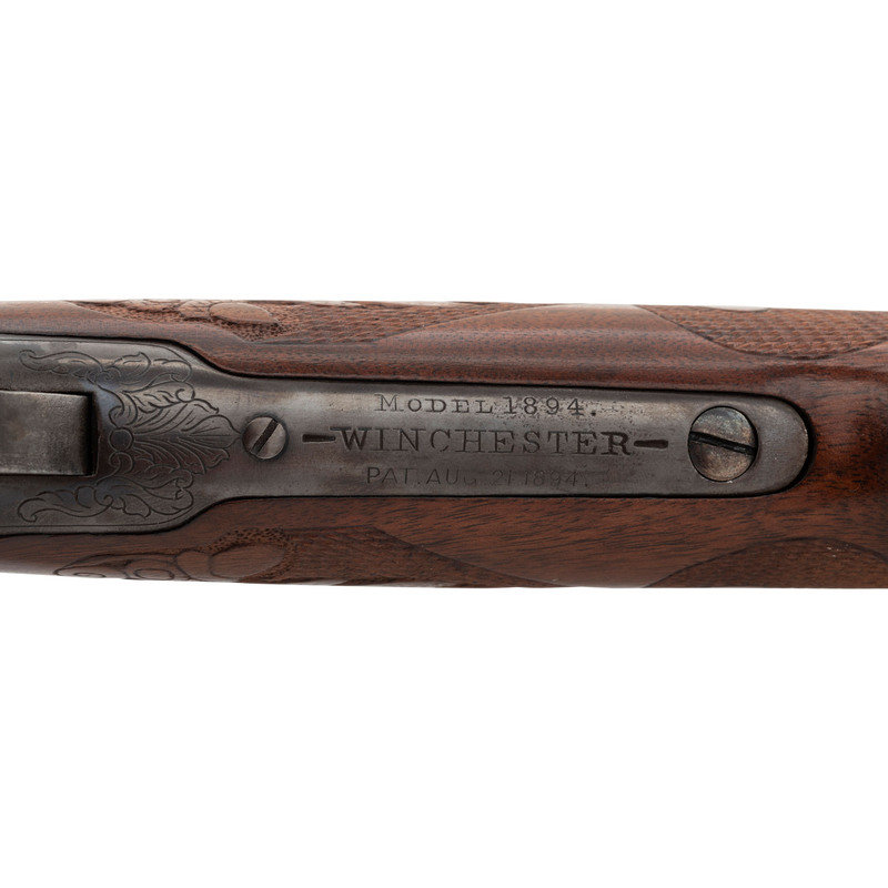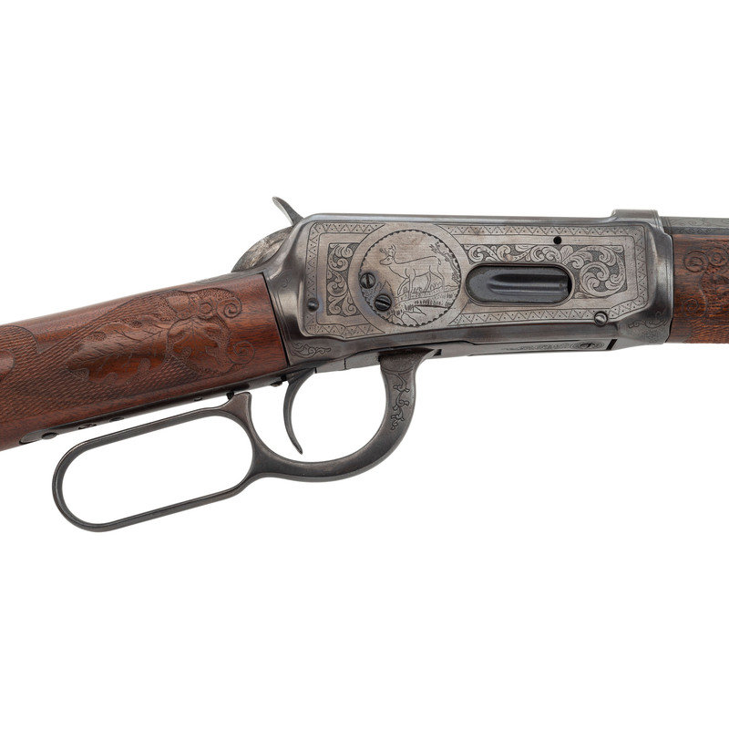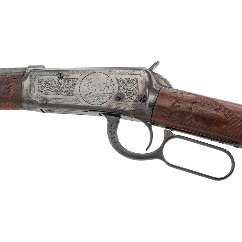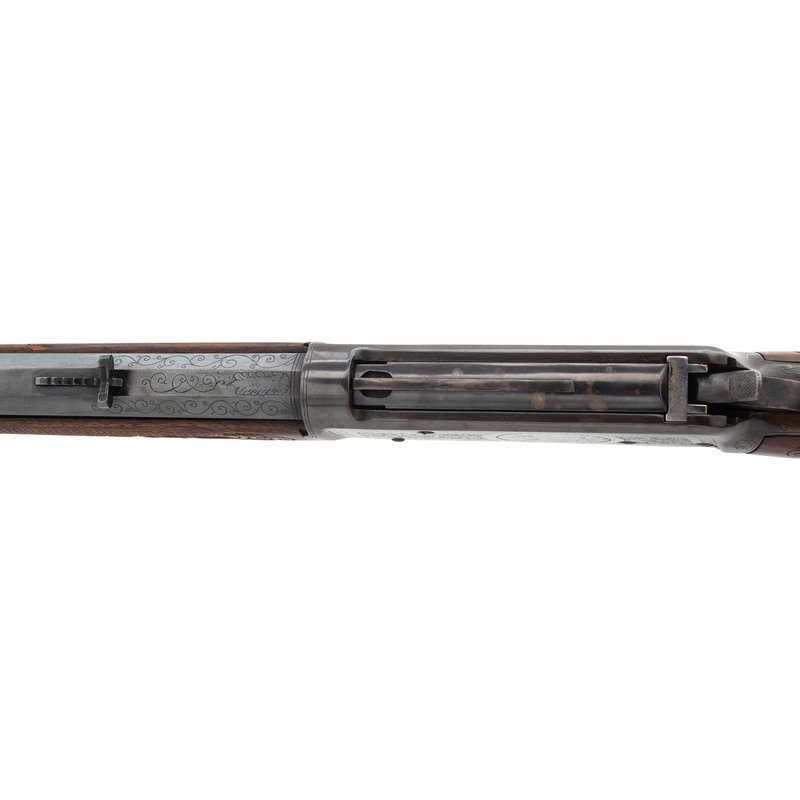 .38-55 WCF. 26" octagonal barrel length. SN: WRACO. Blued metal finish. Two piece walnut stock has style "D" oak leaf checkering to straight grip and forearm. Lever action rifle with full tube magazine, and adjustable notch rear sight and blade front sight. Item features stag game scenes engraved to both sides of frame, surrounded by scroll, punch dot fill, and zig zag borders. Tangs are engraved with floral scroll. Barrel is engraved with simple scroll. Engravings and stock checkering done at a later date. Original date of manufacture is unable to be determined due to re-serialization, but is most likely sometime between 1900 and 1903.