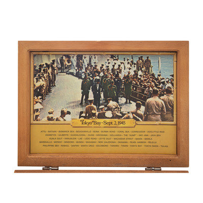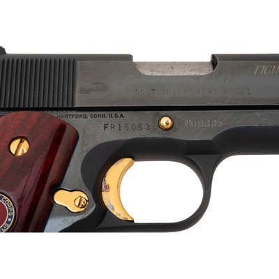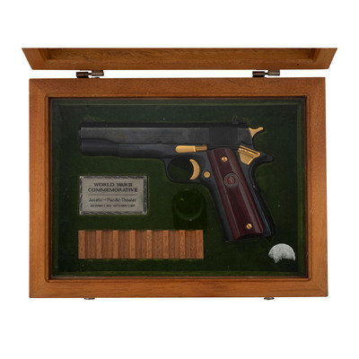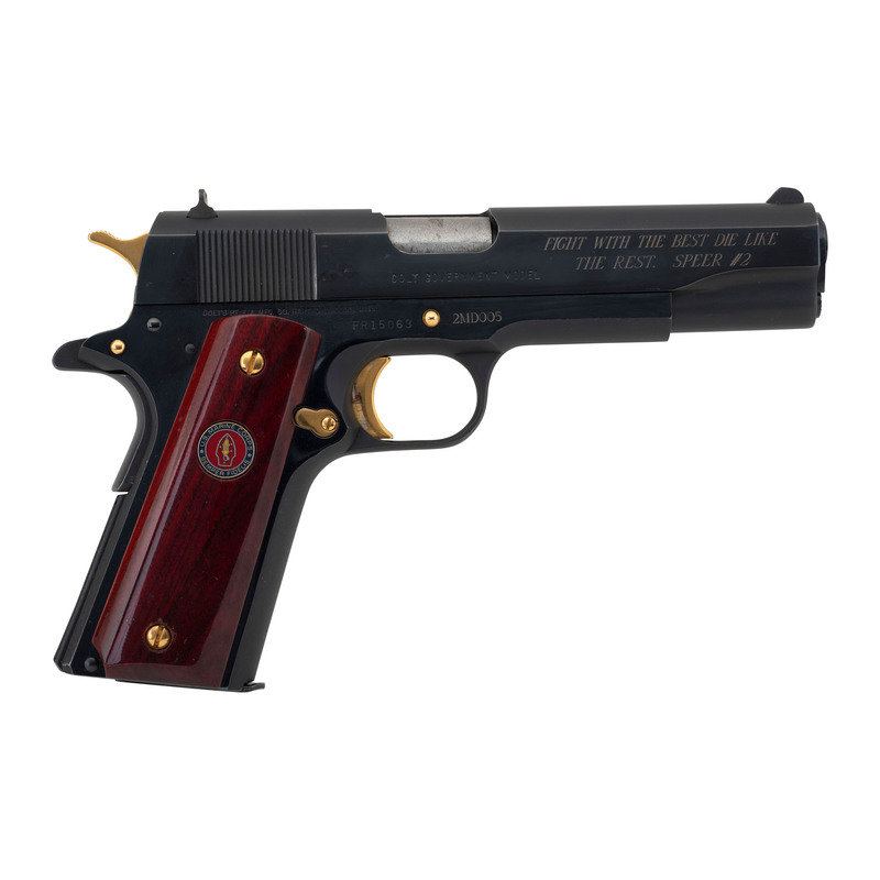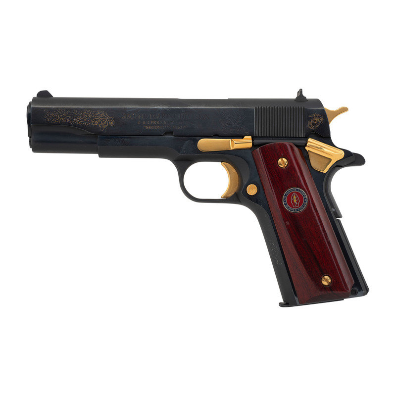 .45 ACP. 5" barrel length. SN: FR15063. Blued metal finish, gold small parts, polished barrel, polished walnut grips with Marine Corps medallions. Short-recoil operated single action autoloading pistol commemorating the history of the Second Marine Division of the United States Marine Corps during World War II. The left slide has been engraved with oak leaf scroll enclosing SECOND MARINE DIVISION/1 FEBRUARY 1941/"SECOND TO NONE" with the {Seal of the USMC} engraved into the left slide behind the cocking serrations. The right slide is further engraved FIGHT WITH THE BEST DIE LIKE/THE REST. SPEER #2. Item features standard Colt Government model make and model markings elsewhere. Comes in a wood display case with pull out drawer with green velvet liner, spaces for seven cartridges, and a panel reading WORLD WAR II/COMMEMORATIVE/Asiatic-Pacific Theater/December 7, 1941-September 2, 1945. The exterior case lid is carved with bamboo motif, while the interior features a color photograph of the Signing of the Instrument of Surrender aboard USS Missouri labeled Tokyo Bay-Sept. 2, 1945 above a listing of some of the Second Marine Division's most important operations connected to WWII. Item comes with a single COLT marked magazine and no key.