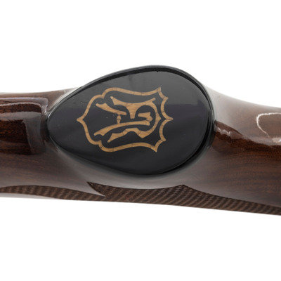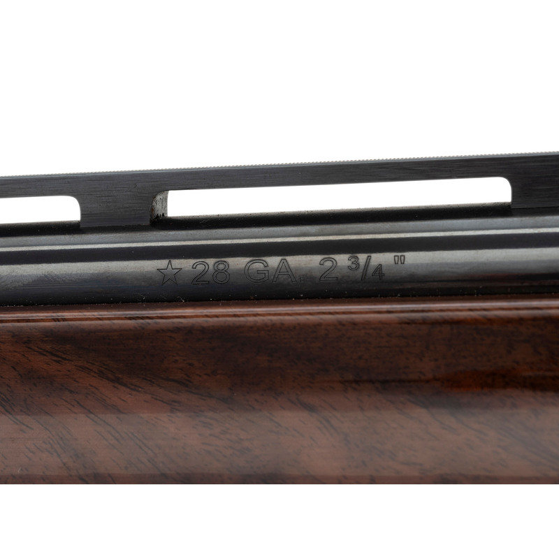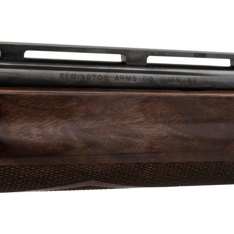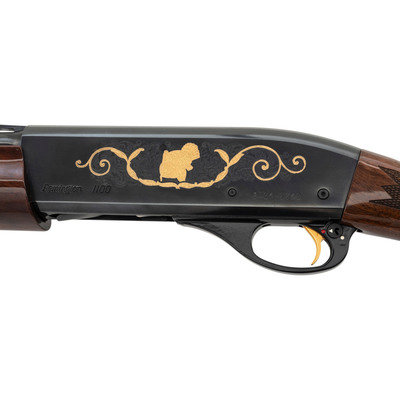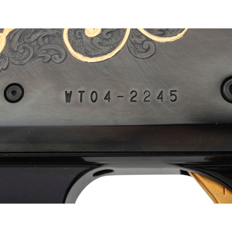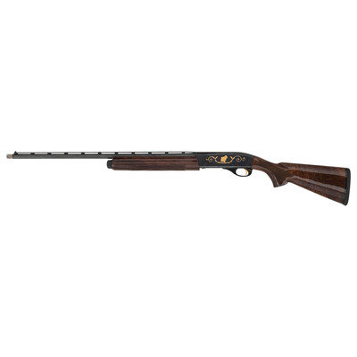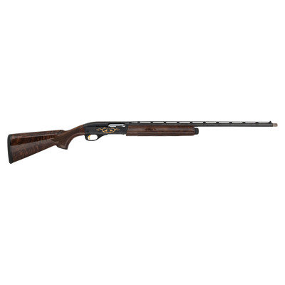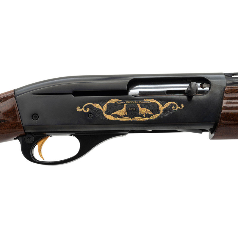 28 Gauge. 25" barrel length. SN: WT04-2245. 2.75" chamber length. Modified Choke. 14" length of pull. 1.5" drop to comb. 2.25" drop to heel. Blued metal finish with full length barrel rib, polished bolt, and mounting polished fancy grade walnut semi pistol grip stock. Semi-automatic tube magazine fed autoloading shotgun commemorating the National Wild Turkey Federation. The right receiver is engraved with floral scroll and a gold leaf banner enclosing two gold turkeys beneath gold inlaid letters reading National Wild Turkey Federation/2004. Left receiver features a gold male turkey within a further gold leaf banner over a spiral scroll engraved ground. Standard model marks read Remington 1100 on the left receiver with standard markings over the barrel. Shotgun mounts twin bead sights and a removable choke.
