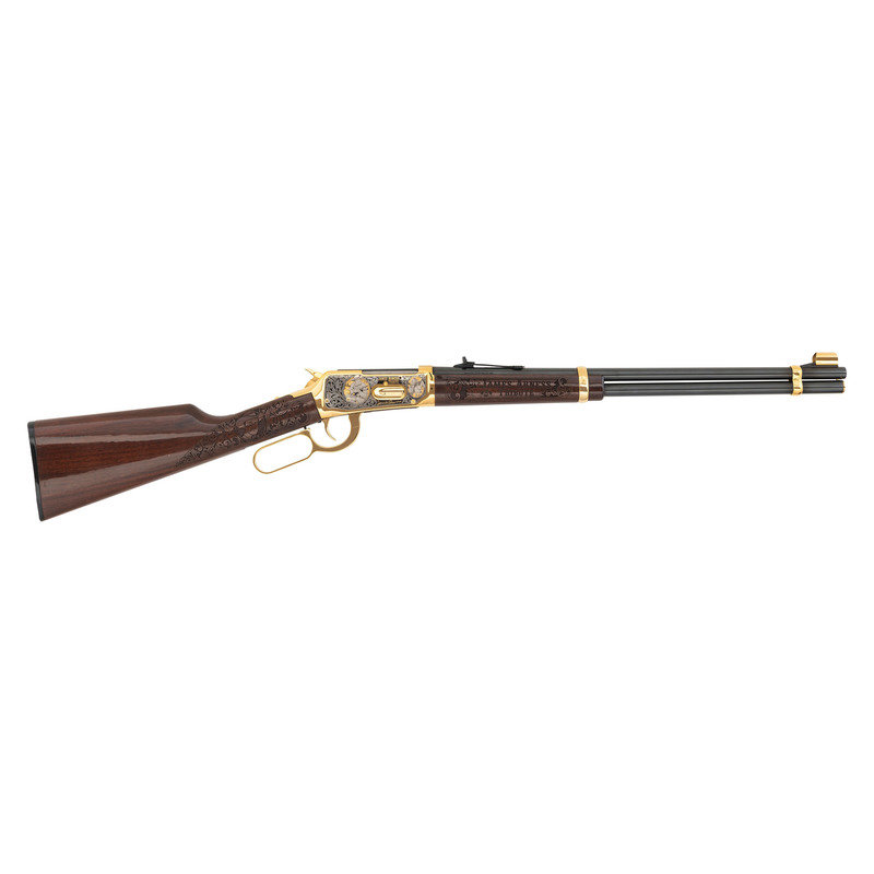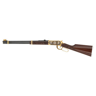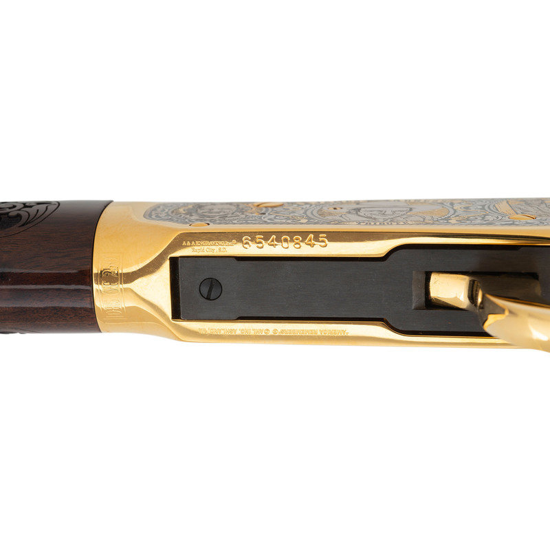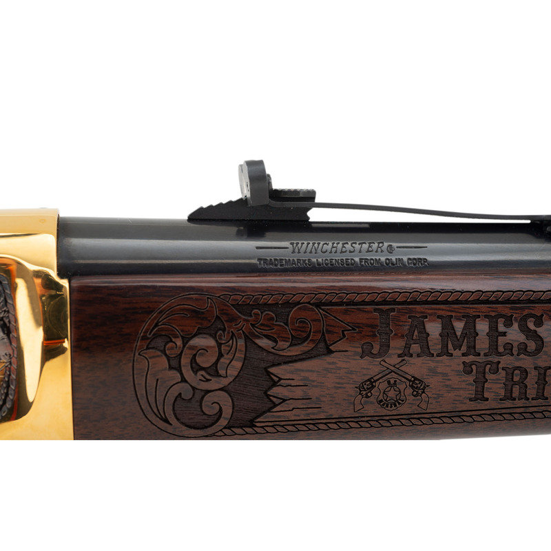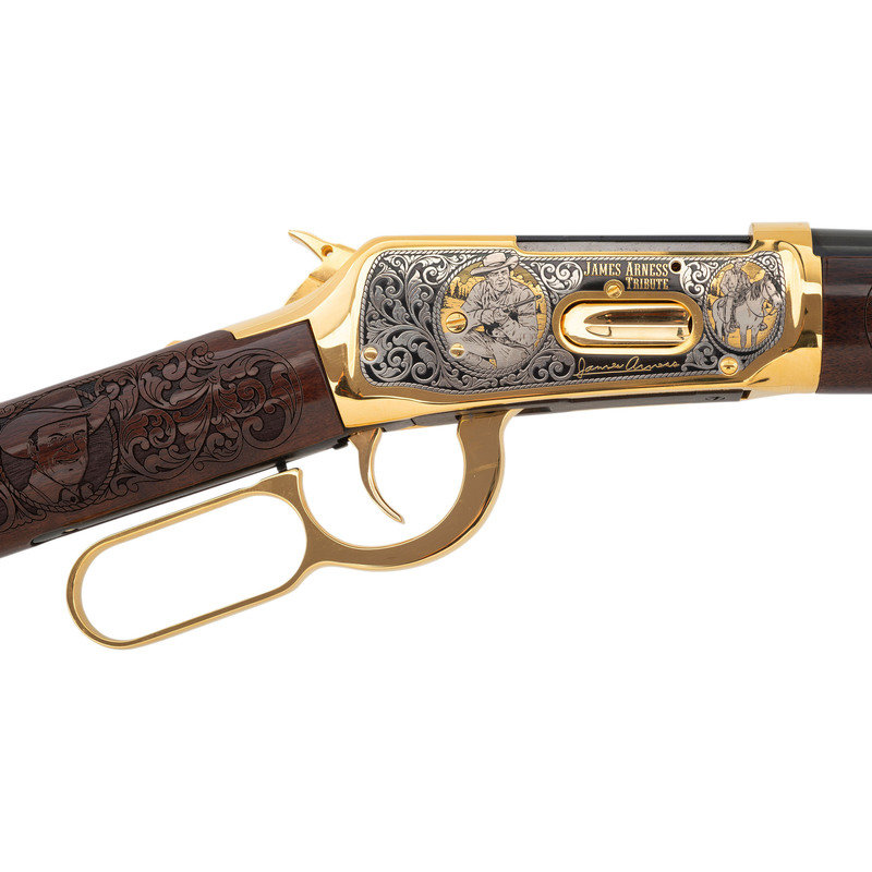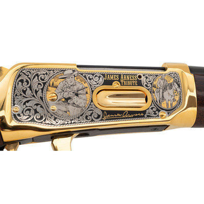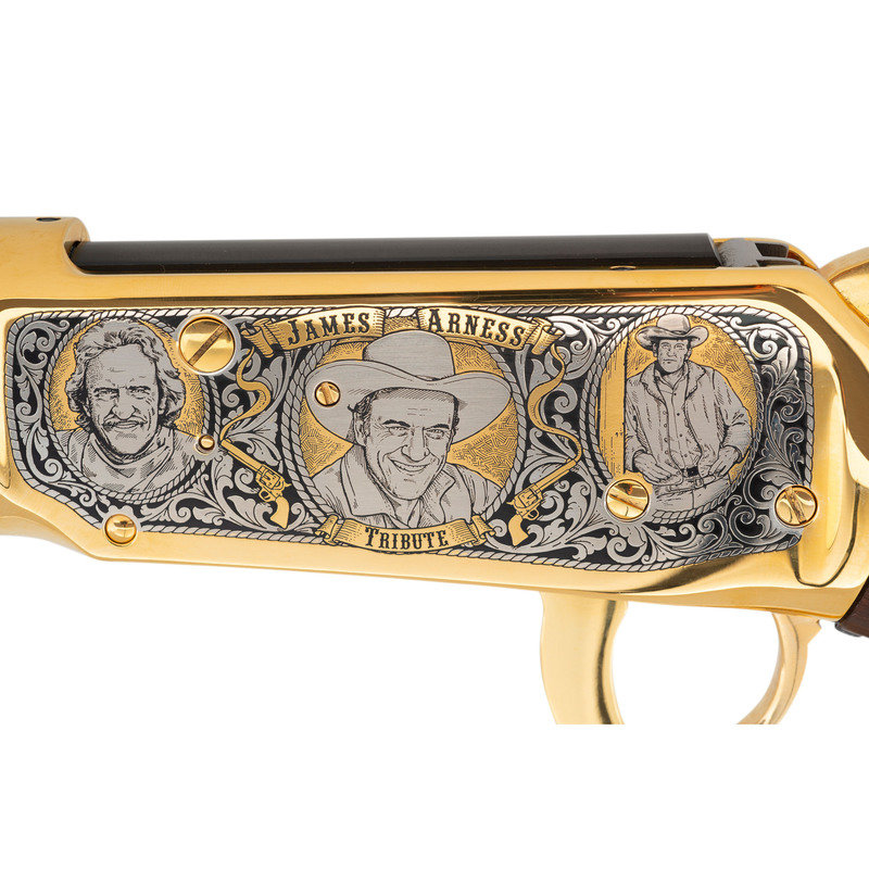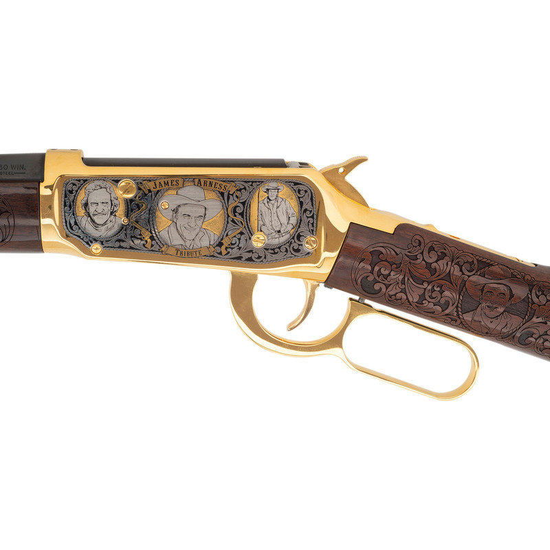.30-30 WIN. 20" barrel length. SN: 6540845. Blued metal finish to barrel, with gold plated frame and fittings and silver plated details. Two piece walnut stock has carved floral scroll and James Arness vignettes to both sides of straight grip, and floral scroll with JAMES ARNESS/TRIBUTE carved to both sides of forearm. Lever action rifle with an adjustable notch rear sight, hooded blade front sight, and full tube magazine. Frame features silver plated floral scroll details surrounding three vignettes of James Arness to both sides.