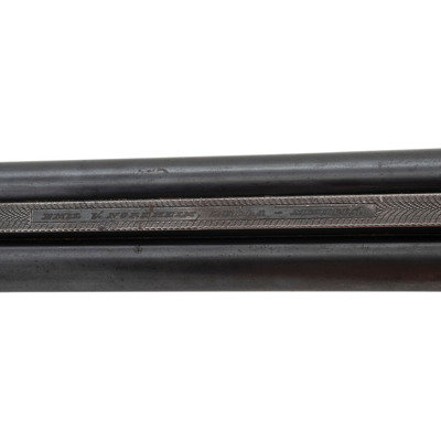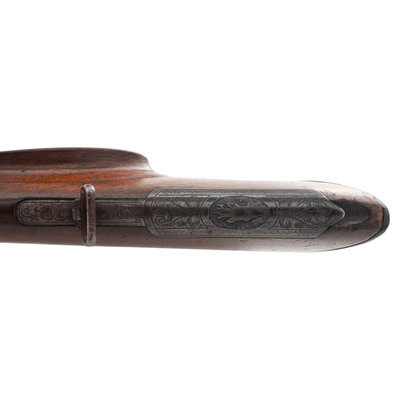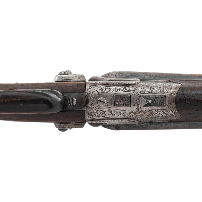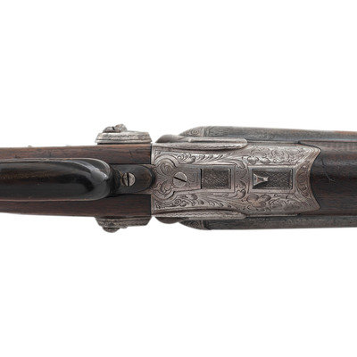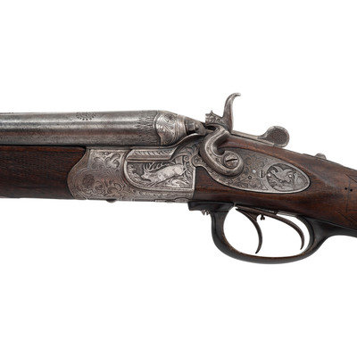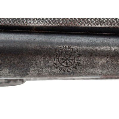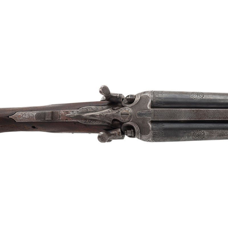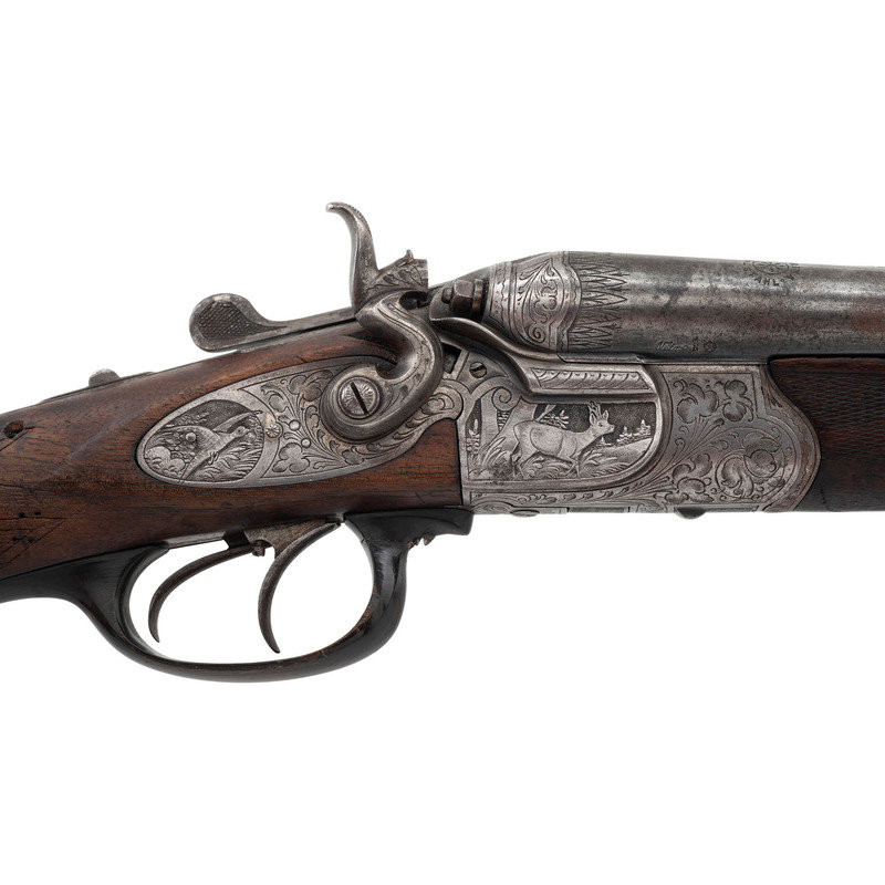 16 gauge/7.65mm. 27.5" barrel lengths. SN: 2087. Blued metal finish to barrels and possible case hardened frame and fittings. Two piece walnut stock has checkering to semi pistol grip and Schnabel forend, as well as carved cheek rest to left side. German drilling gun with side by side shotgun barrels over a rifle barrel, as well as flip up rear notch sight that is engaged with toggle on wrist and blade front sight. Item features a horn triggerguard, matted rib, double triggers, double spur hammers, double sling swivels, and a cartridge compartment to bottom edge of stock. Markings include Prima Krupp Stahl marks to both shotgun barrels and EMIL V. NORDHEIM , ZELLA-MEHLIS to flat of barrel rib. Stock appears to be carved Ernst Lubke/Schwarzenmoor5/uber Herford on right side of butt. Frame is heavily engraved with black leaf scroll overall that surrounds game scenes of elk and birds (possibly partridges) on left side, and game scenes of stag and pheasant to right side. Cartridge compartment cover is also engraved with black leaf scroll and a vignette of a stag head. Other engraved details include fish fin sections to both sides of frame, rosette screws, neoclassical hatch motifs to lugs, and egg and arrow details to barrel.