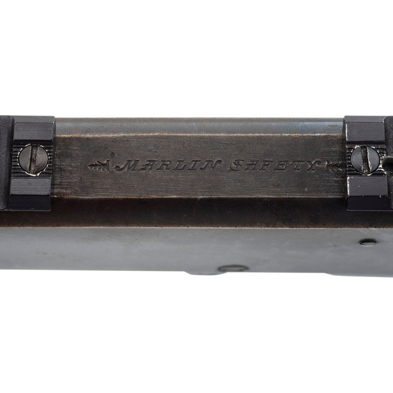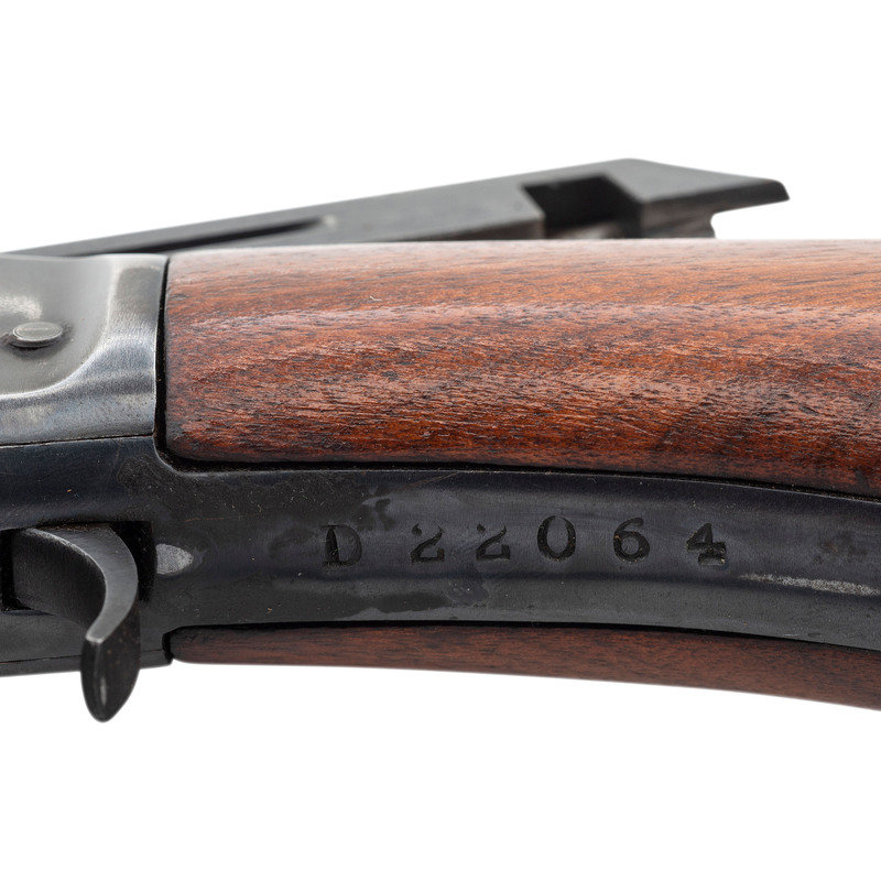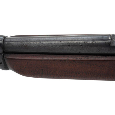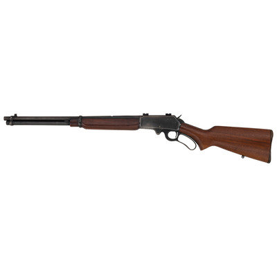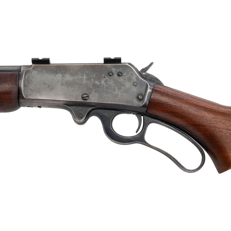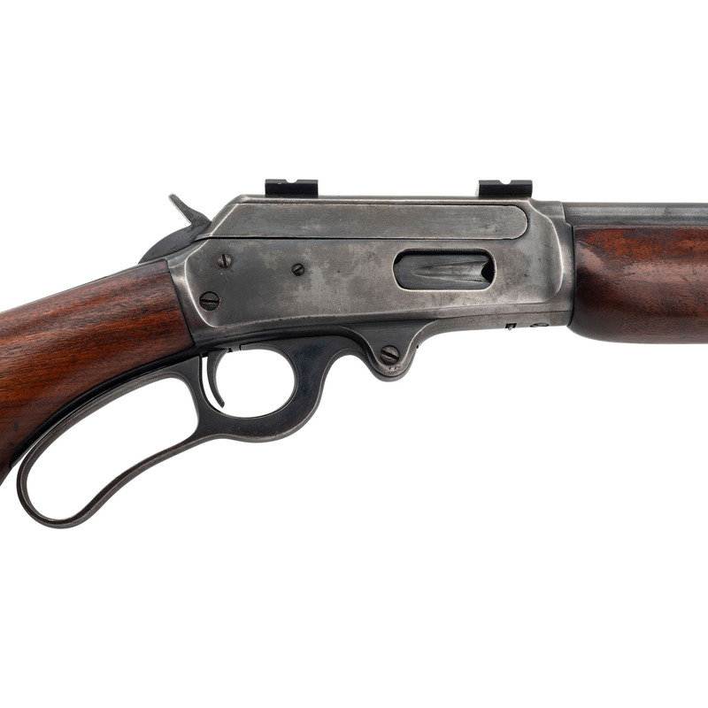 .32 special. 20" barrel length. SN: D22064. Blued metal finish. Two piece walnut stock has a plain semi pistol grip and forearm with single barrel band. Lever action rifle with a full tube magazine and blade front sight. Item features scope mounts to top of receiver and a single sling stud to bottom edge of stock.