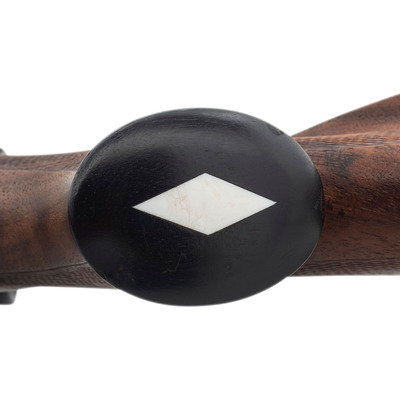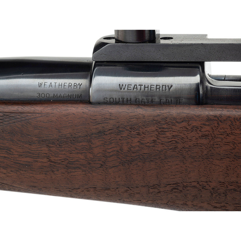 .300 WBY Mag. 26" barrel length. SN: 732 (Mfg. ca.1951). Blued metal finish. Walnut Monte Carlo-style stock has checkering to semi pistol grip and forearm, as well as ebony forend and ebony grip cap with diamond faux pearl insert. Bolt action rifle with an internal box magazine and Weatherby Supreme 3-9x44mm scope. Item features mauser action, double sling studs, and a vented rubber recoil pad. Receiver ring is marked WEATHERBY/SOUTH GATE, CALIF. on left side.