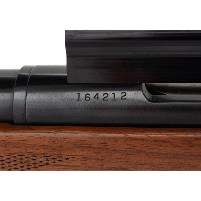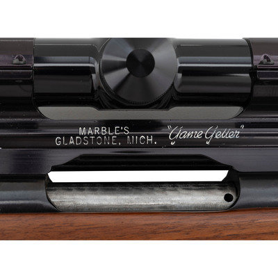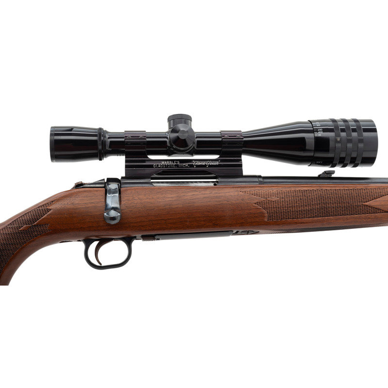 .243 WIN. 21" barrel length. SN: 164212. Blued metal finish. Full length Monte Carlo-style walnut stock has checkering to semi pistol grip and forearm. Bolt action rifle with adjustable folding notch rear sight and blade front sight. Item features an internal box magazine, rubber recoil pad, spoon handle bolt, and Weaver 15x42mm scope on a Marble's "Game Getter" raised scope mount.