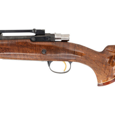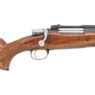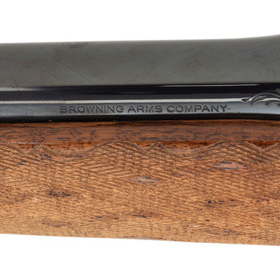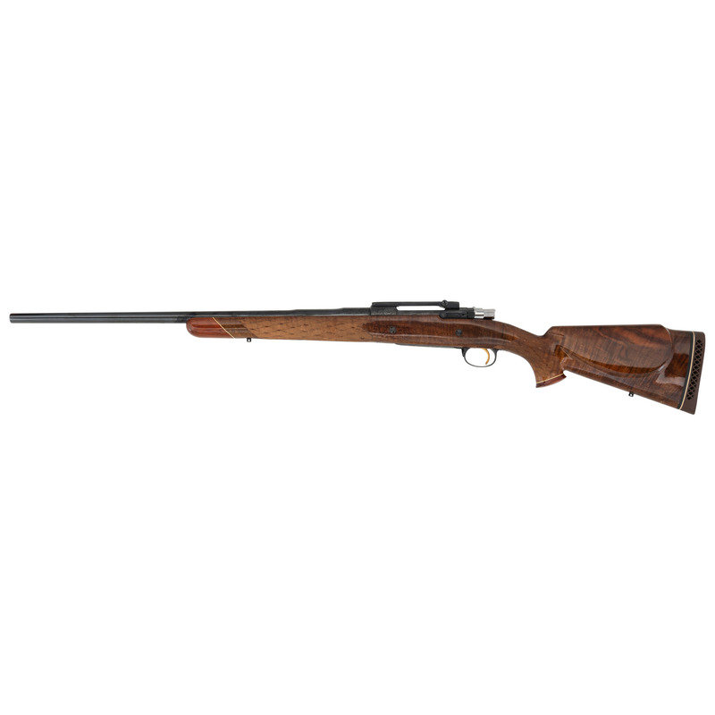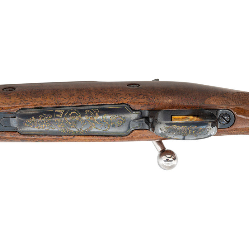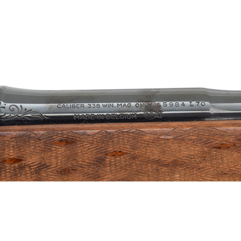.338 Win. Mag. 24" barrel length. SN: 55984 L70. Blued metal finish with polished bolt and set in an upgraded wood walnut Monte-Carlo stock with rosewood forend and pistol grip caps, and featuring skip line checkering to the wrist and forend. Bolt action repeating rifle fed by an internal magazine and mounting a one piece Redfield style scope base. The serial numbers of the receiver and barrel match, and the standard model markings indicate the rifle was manufactured in Belgium. The receiver and rear barrel feature floral scroll embellishments that are complemented by a Ram's Head motif engraved onto the base of the magazine. White line spacers are installed on the endcaps and recoil pad, and the rifle features a gold trigger with vertical serrations.