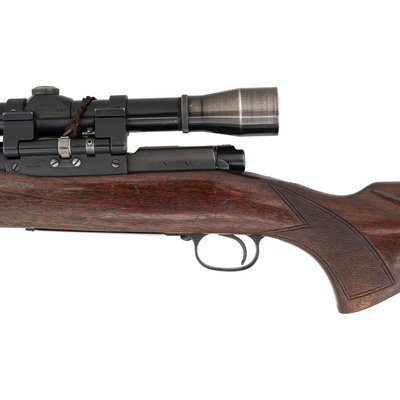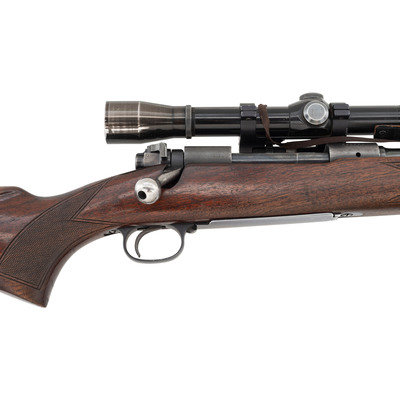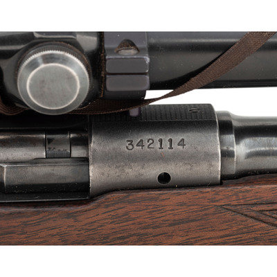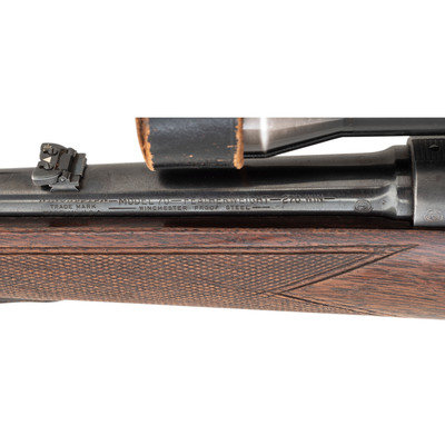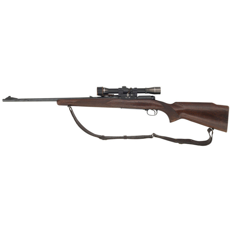 .270 WIN. 22" barrel length. SN: 342114 (Mfg. ca.1955). Blued metal finish. Walnut stock has checkering to semi pistol grip and forearm, as well as a raised comb. Bolt action rifle with folding adjustable notch rear sight and blade front. Item features an internal box magazine, double sling swivels, and a Lyman All-American 4x scope mounted on a Pachmayr flip-over scope mount. Scope has part of a black leather lens cover over objective lens. Includes a brown leather sling.