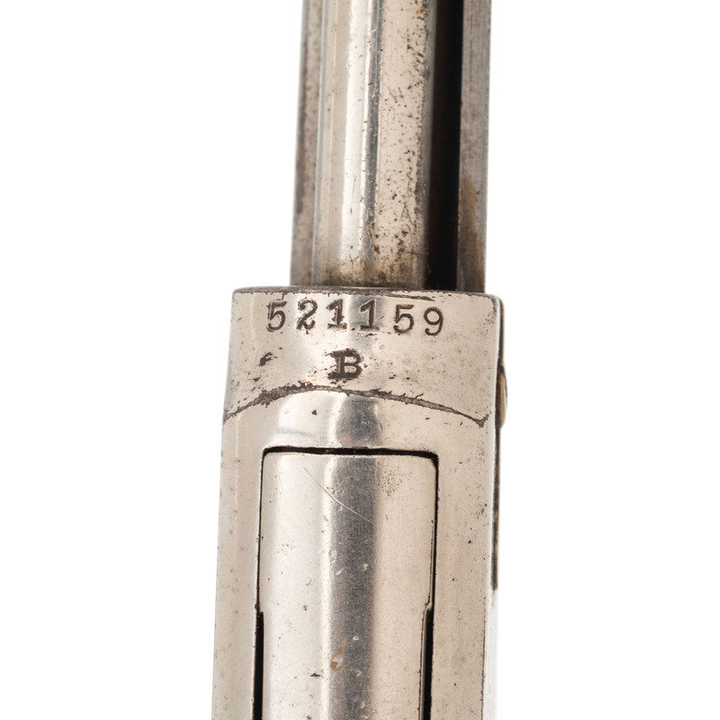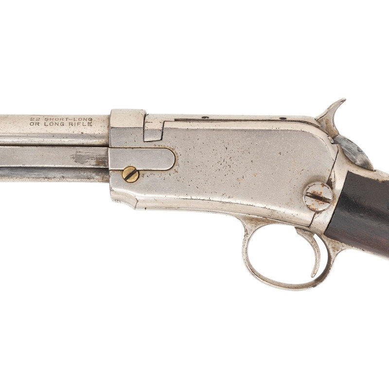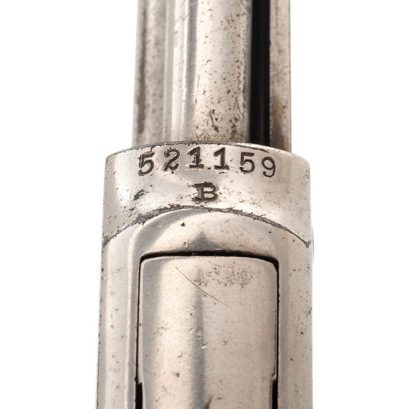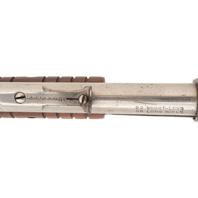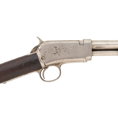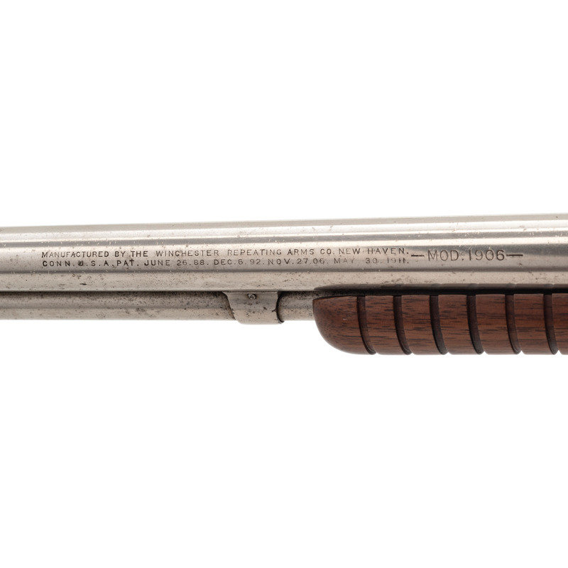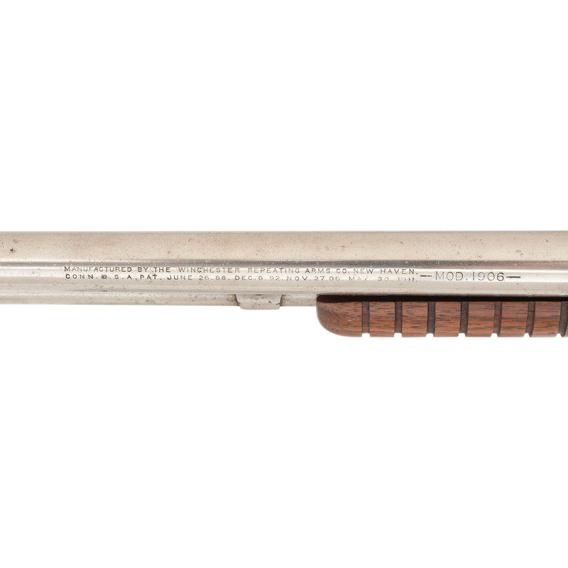 2.) Winchester Model 1906 - .22 S/L/LR. 20" barrel length. SN: 521159 (Mfg. ca.1918). Nickel plated finish. Two piece walnut stock has a plain straight grip and grooved forearm that appears to have been replaced at some point. Slide action rifle with adjustable notch and blade sight. Item features a 7/8 tube magazine, takedown knob, and hard rubber buttplate.