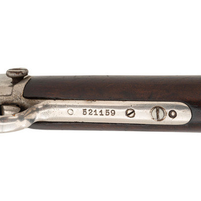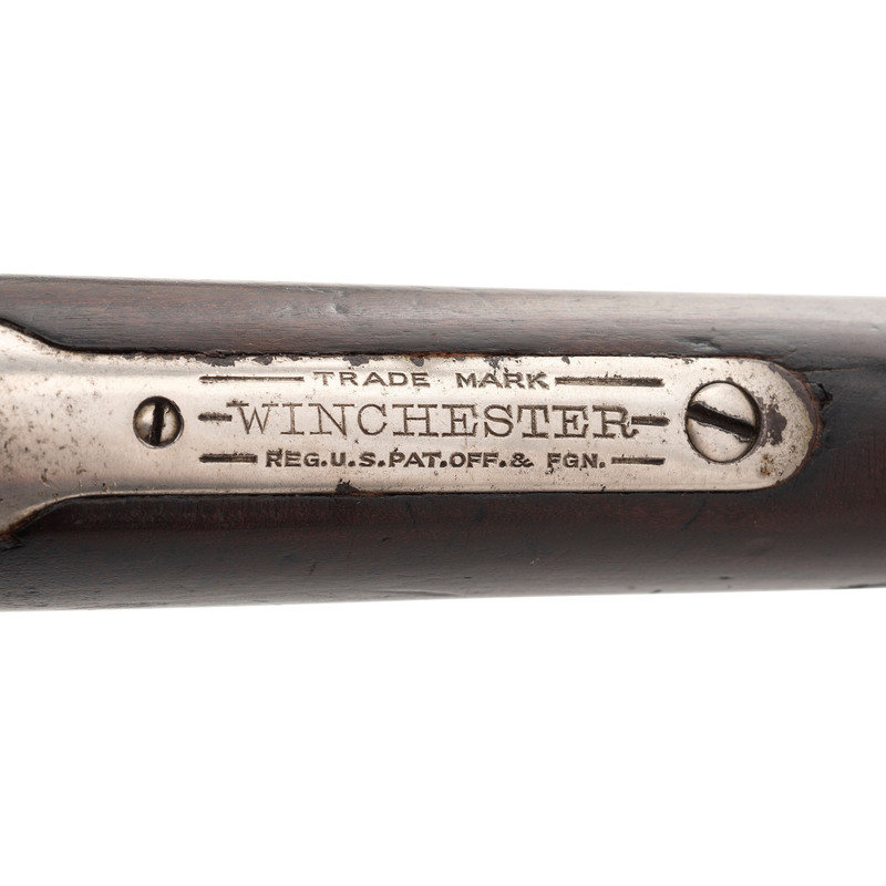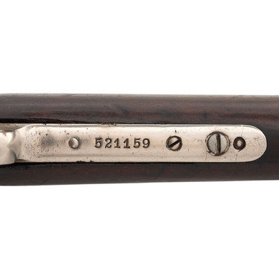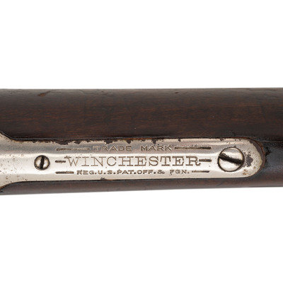 1.) Winchester Model 1890 - .22 Short. 24" octagonal barrel length. SN: 448726 (Mfg. ca.1911). Blued metal finish. Two piece walnut stock has a plain straight grip and grooved forearm. Slide action rifle with adjustable notch rear sight and blade front sight. Item features a 3/4 tube magazine, takedown knob, and smooth crescent buttplate.