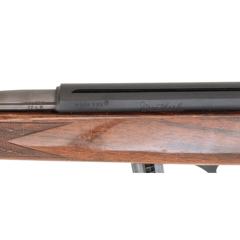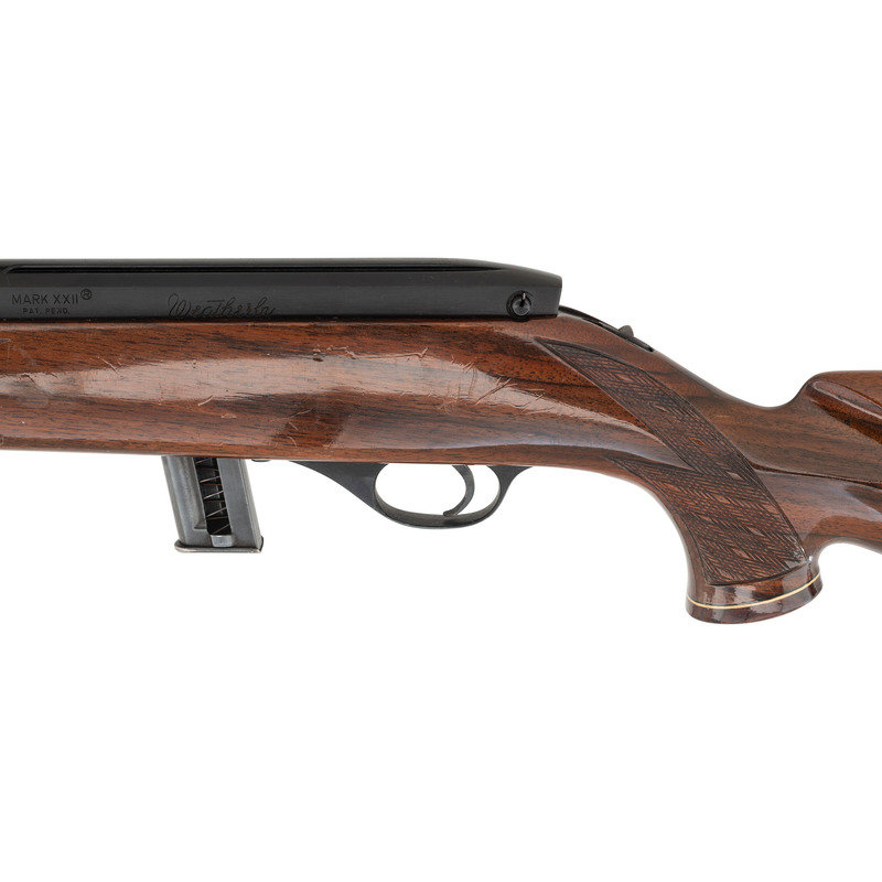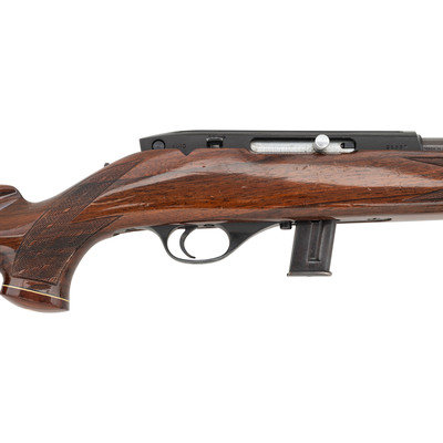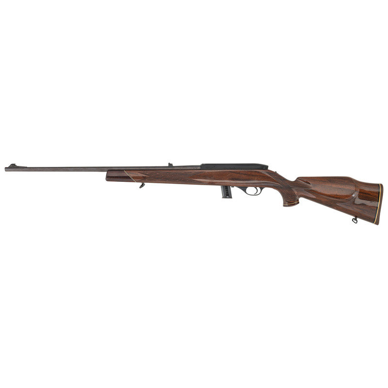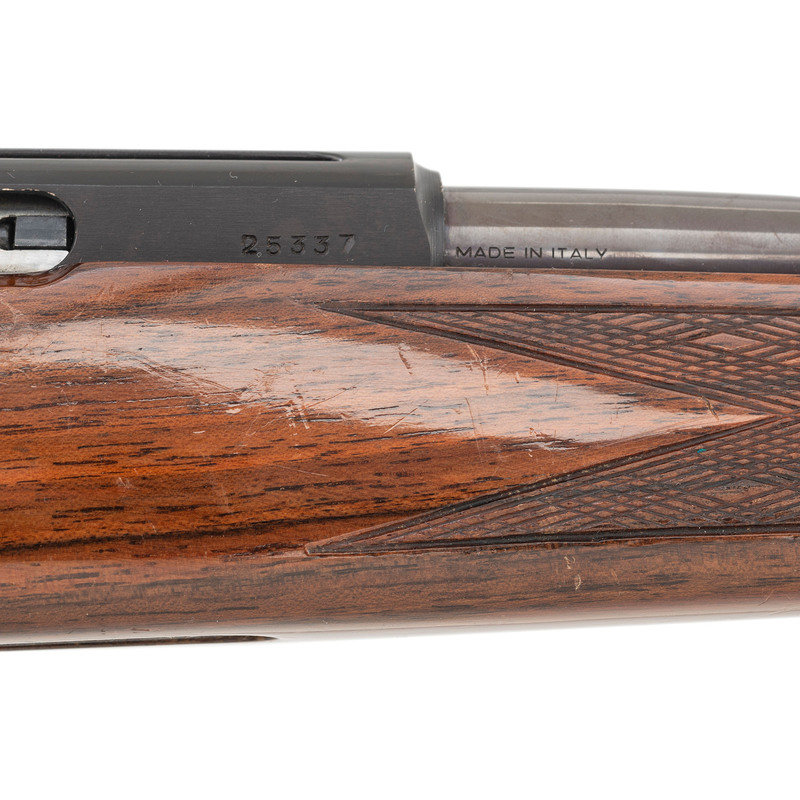 .22 LR. 24" barrel length. SN: 25337. Blued metal finish with black alloy receiver. Walnut stock has checkering to semi pistol grip and forearm, with rosewood caps and ivory spacers to grip and forend. Semi automatic rifle with two leaf folding notch rear sight and blade front sight. Item features a removable magazine, double sling swivels, and rubber recoil pad with ivory spacer. Made in Italy.