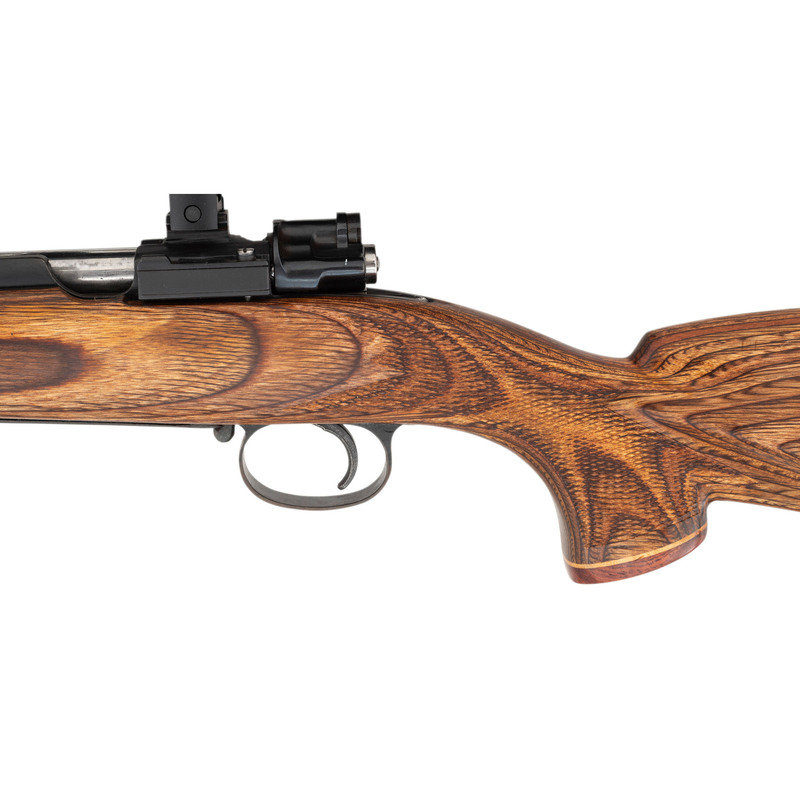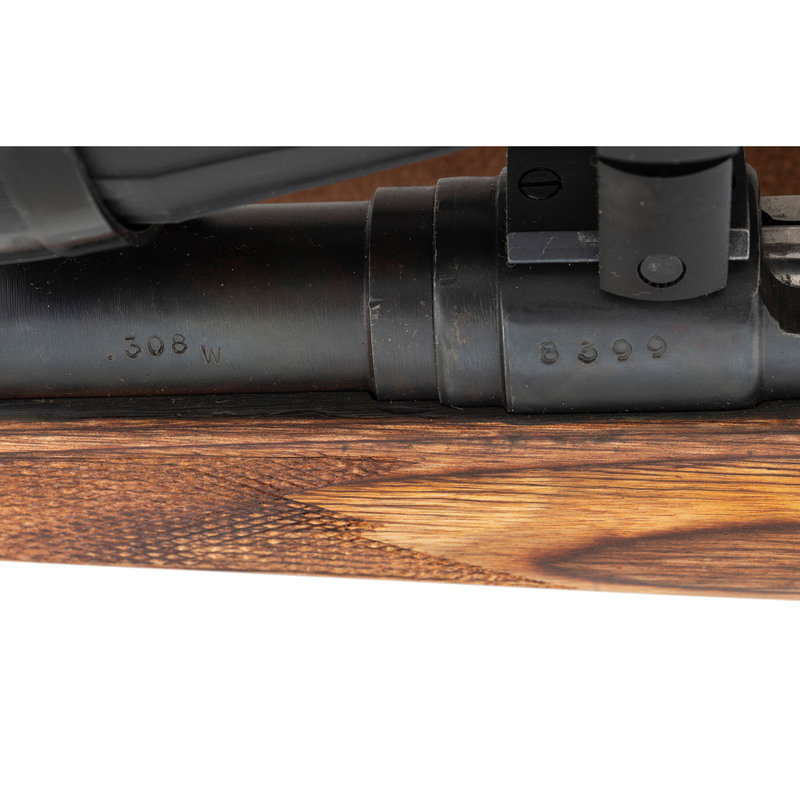 .308 WIN. 24" barrel length. SN: 8399. Parkerized metal finish. Hardwood stock has a cheek piece to left side, checkering to semi pistol grip and forearm, and rosewood caps to grip and forend. Bolt action rifle with BEC Inc. 3-9x40mm scope. Item features an internal box magazine, vented rubber recoil pad, and leather sling.