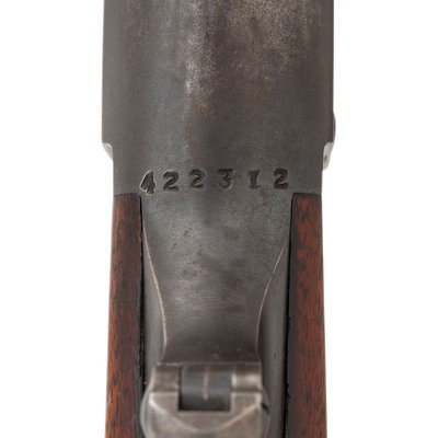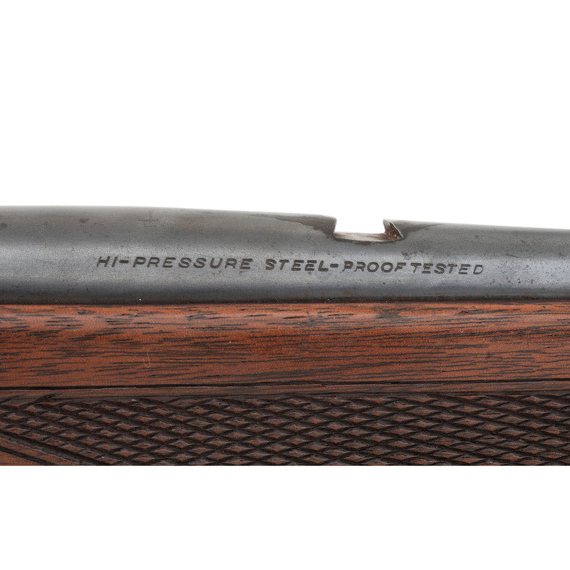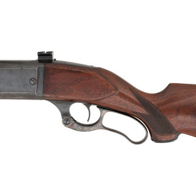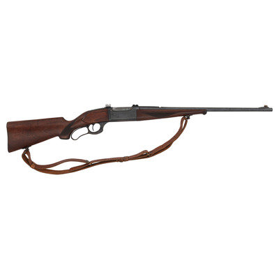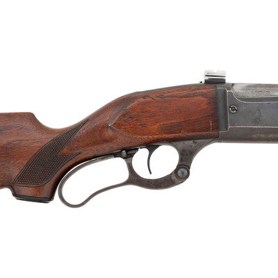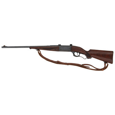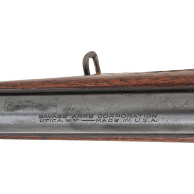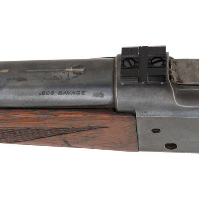 .303 Savage. 22" barrel length. SN: 422312 (Mfg. ca.1943). Blued metal finish. Two piece walnut stock has checkering to semi pistol grip and Schnabel forearm. Lever action rifle with an internal rotary magazine and German silver blade front sight. Item features double sling swivels and scope mounts to receiver. Rear sight has been removed. Includes a brown leather sling. Serial number exists outside of known production dates 1922-41.