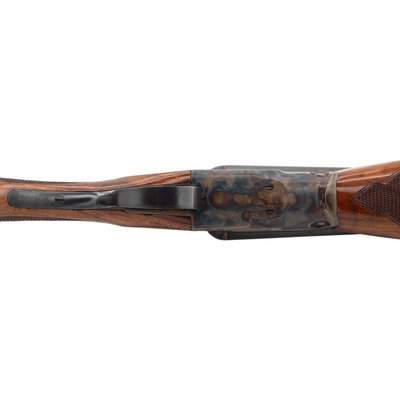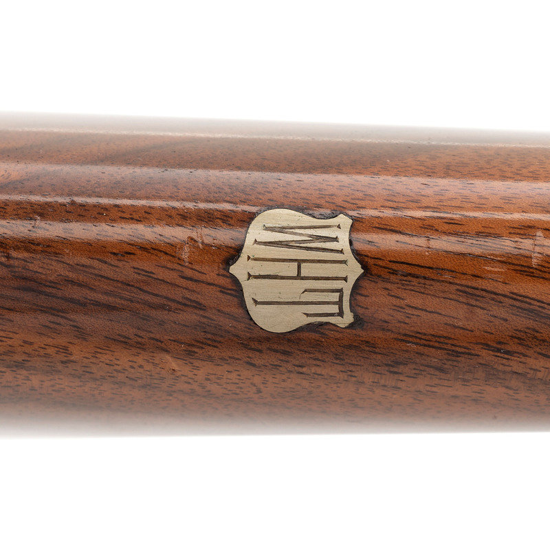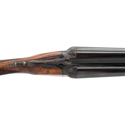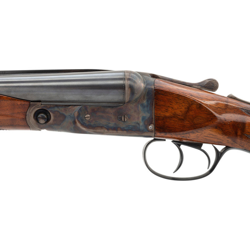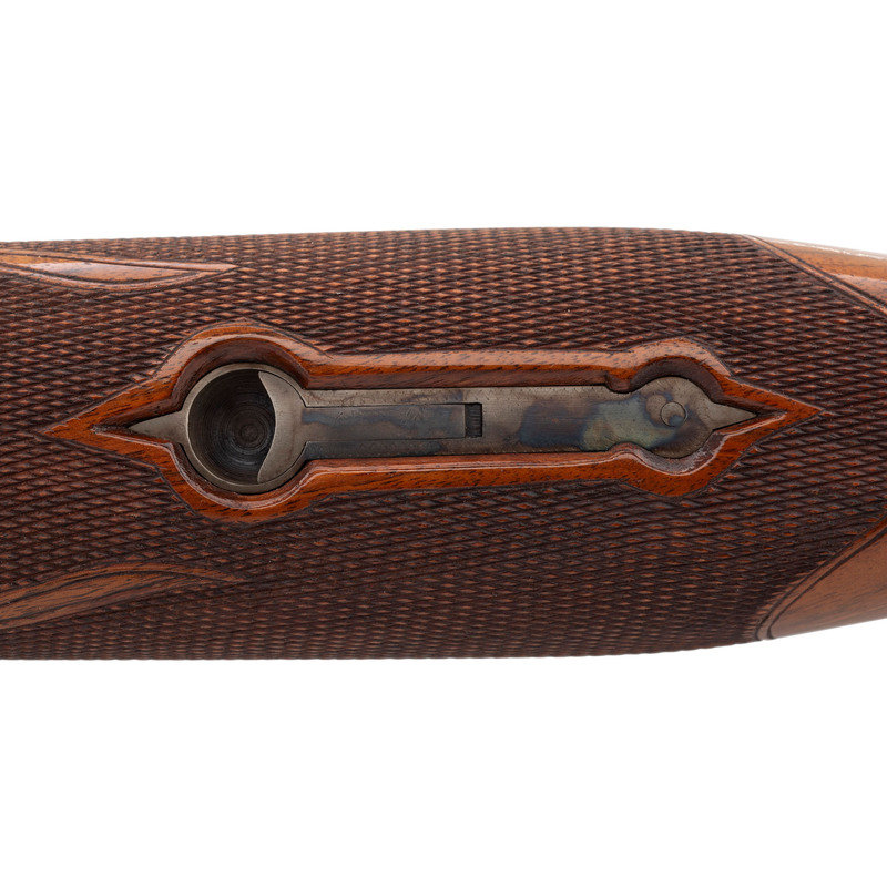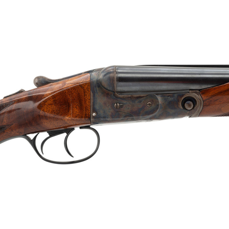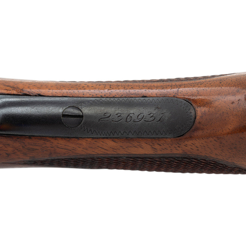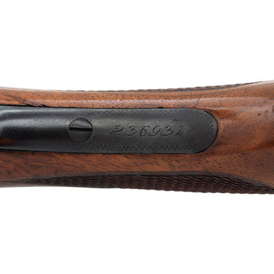 12 gauge. 30" barrel lengths. 15.25" length of pull. 1.5" drop to comb. 2.25" drop to heel. 1-1/2 Frame. Full and improved modified chokes. SN: 236931 (Mfg. Post-1934). Blued metal finish to barrels and case hardened finish to frame. Two piece walnut stock has multi-point checkering to semi pistol grip and beavertail forearm. Break action side by side boxlock shotgun has a Simmons matted low vent rib fixed over solid rib and a steel bead front sight. Item features double triggers, auto ejectors, and a vented rubber recoil pad. Frame is engraved with zig-zag bordering overall, and stock has a shield shaped escutcheon with initials WHT fixed to bottom edge.