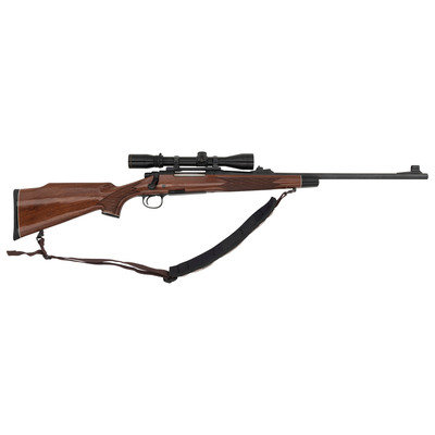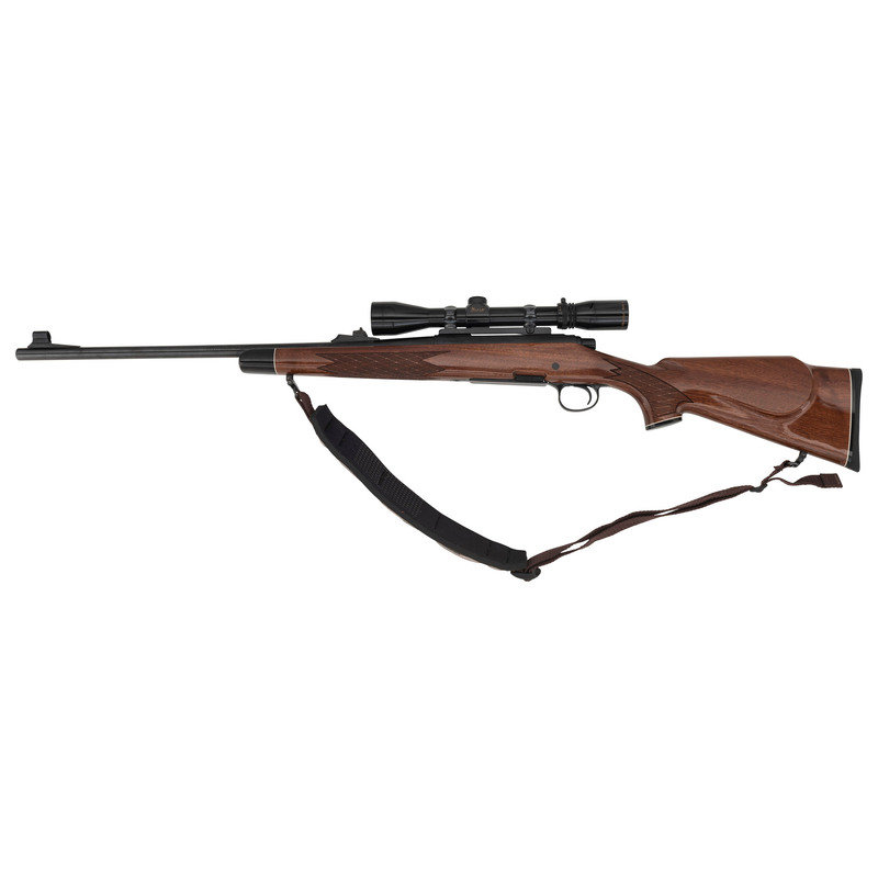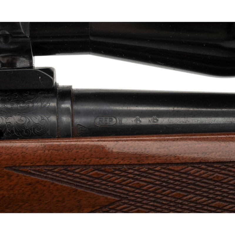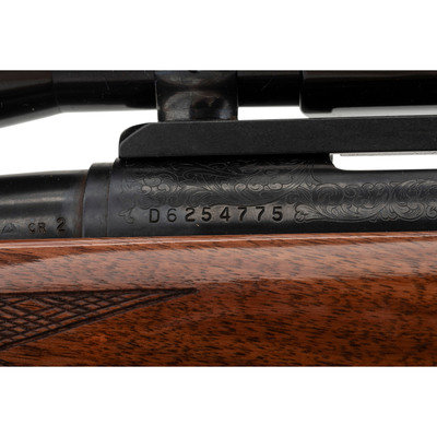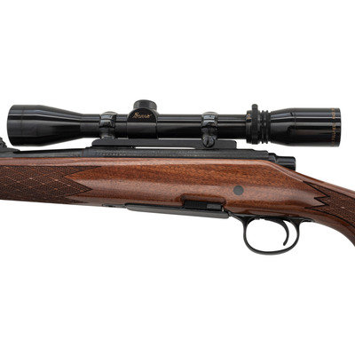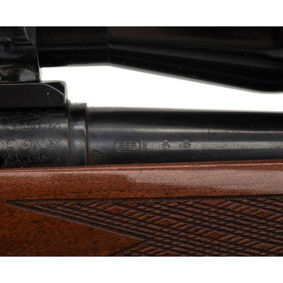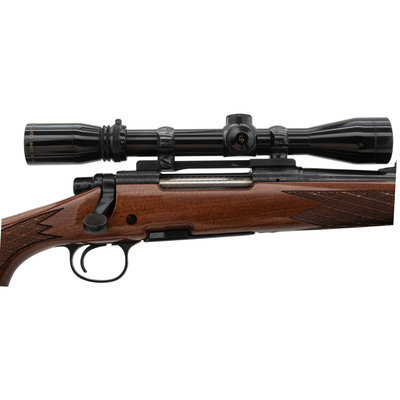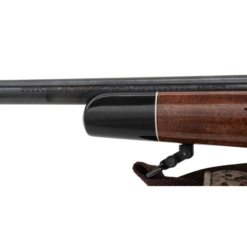 .280 Remington. 22" barrel length. SN: D6254775. Blued metal finish with jeweled bolt and mounting a walnut Monte-Carlo style stock with skip line checkering and synthetic forend and pistol grip caps with white line spacers. Bolt-action repeating rifle fed by detachable box magazines. Item mounts an adjustable rear notch and hooded front bead sights. The receiver shows floral engraved embellishments overall enclosing the model marking Remington/MODEL 700. Item mounts a Burris 3X-9X FULLFIELD telescopic sight on top of a Redfield one piece scope base. Item mounts front and rear sling swivels with an ADVANTAGE/TIMBER sling.