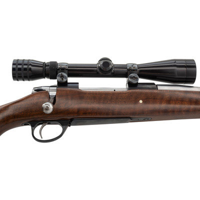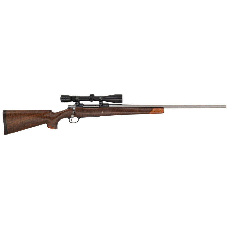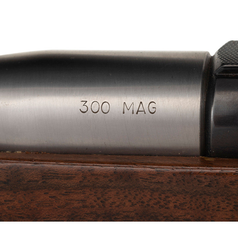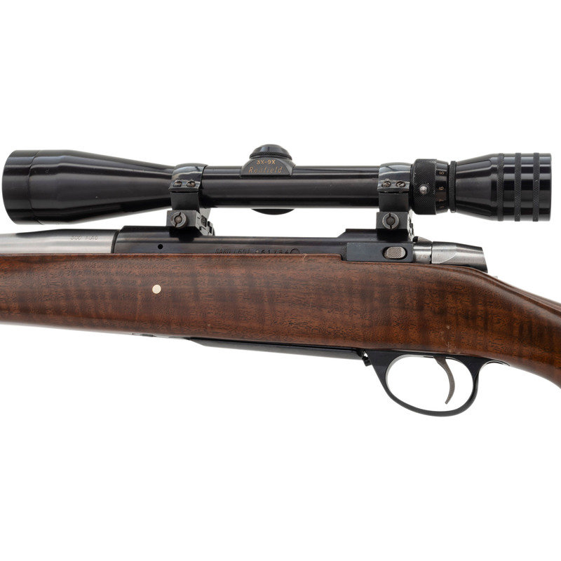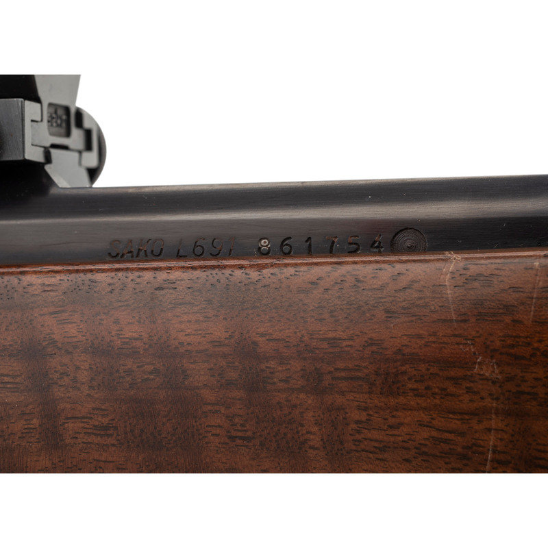 .300 Magnum. 24.5" barrel length. SN: 861754. Brushed stainless steel finish to the barrel and bolt with blued frame and triggerguard set in a walnut Semi pistol grip stock with rosewood forend and pistol grip caps. Bolt action repeating rifle fed by internal box magazine. The rifle mounts a rubber recoil pad and sako marked scope mounts over a dovetailed receiver. Standard make and model markings applied overall. The rifle mounts a Redfield 3X-9X telescopic sight.