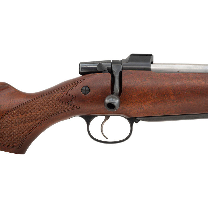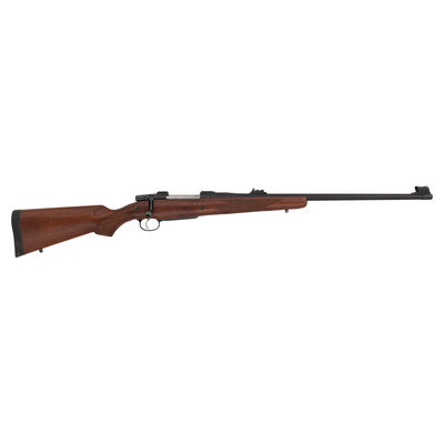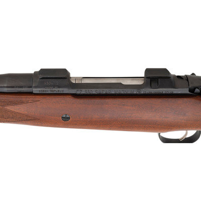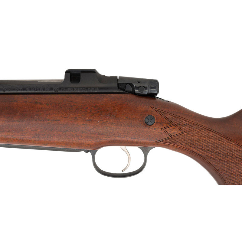 .458 Lott. 25" barrel length. SN: A504712. Blued metal finish. Walnut stock has checkering to semi pistol grip and forearm. Bolt action rifle with three leaf express rear sight and hooded blade front sight. Item features an internal box magazine, double sling studs, and a rubber recoil pad. Included with item is original box.