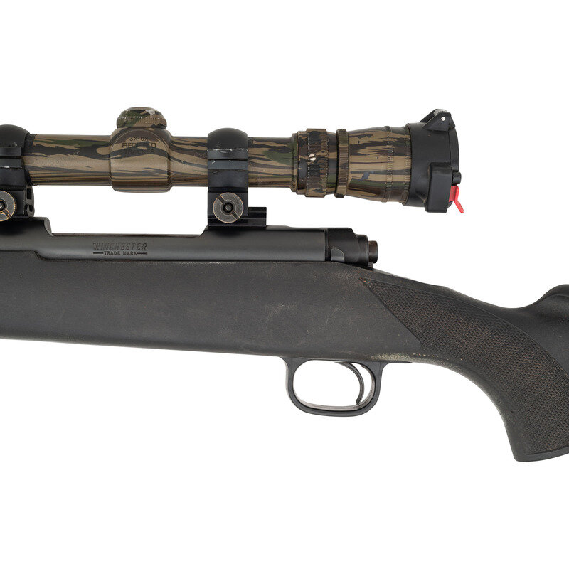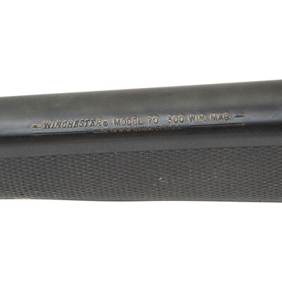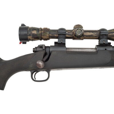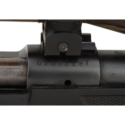 .300 Win Mag. 26.5" barrel length. SN: G2332197. Parkerized metal finish. Black synthetic stock has checkering to semi pistol grip and forearm. Bolt action rifle with an internal box magazine and camouflage Redfield 3-9x40mm scope.
