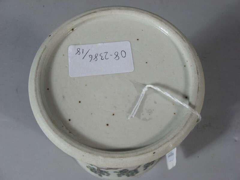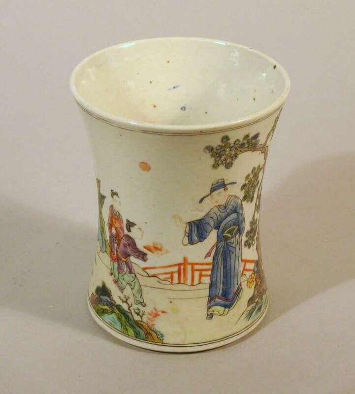 Of dramatically convex form; decorated in polychrome enamel to depict gentleman and youths in outdoor setting.