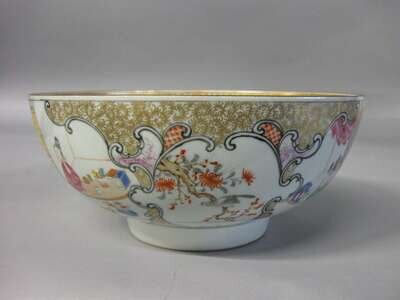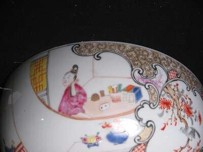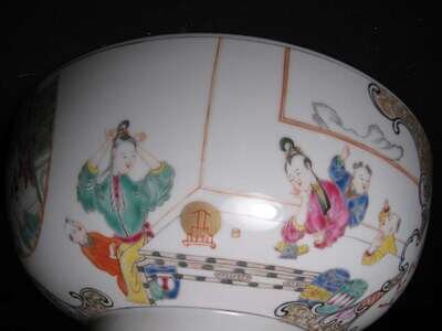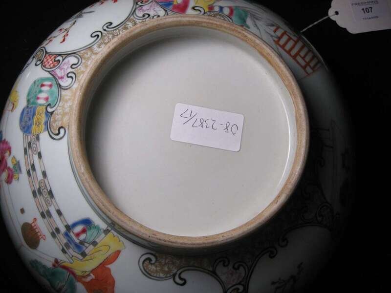 Of wide U-shape raised on foot ring; decorated in polychrome and gilt enamel to depict two domestic scenes between two cartouches with avian subjects; western-style band to interior rim and three boys painted to interior base.