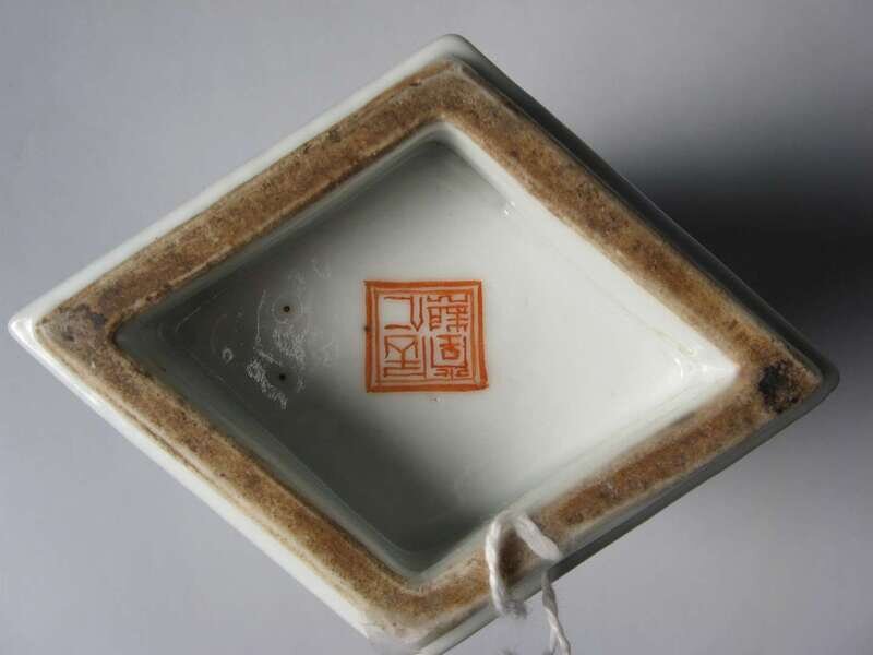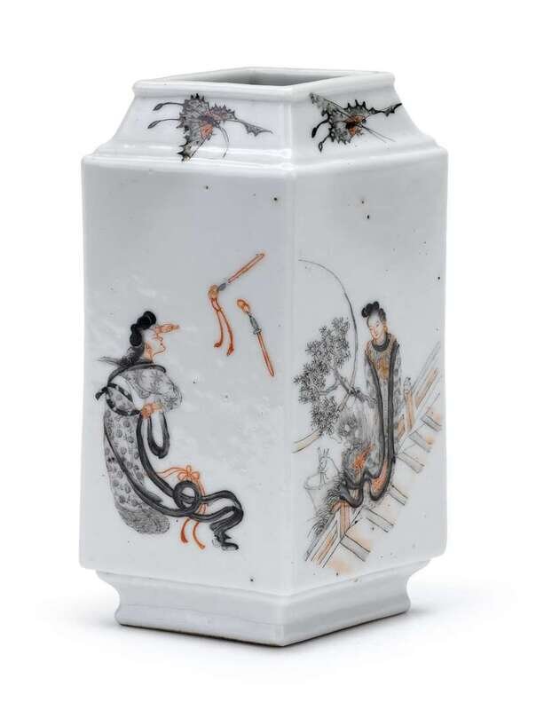 Of square cylindrical form, well enameled in black and iron red to show four figural landscapes.