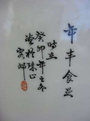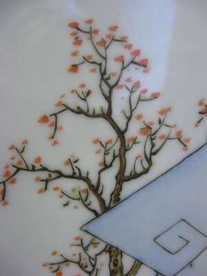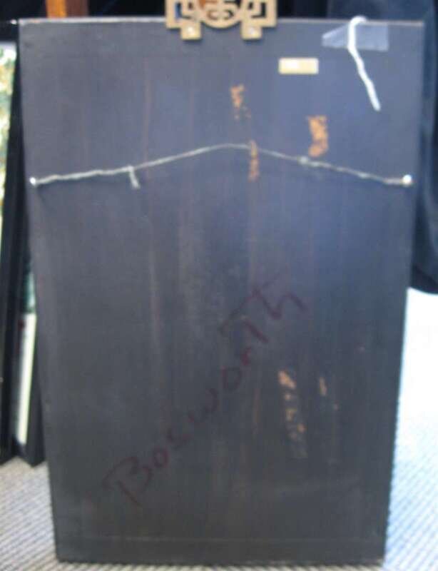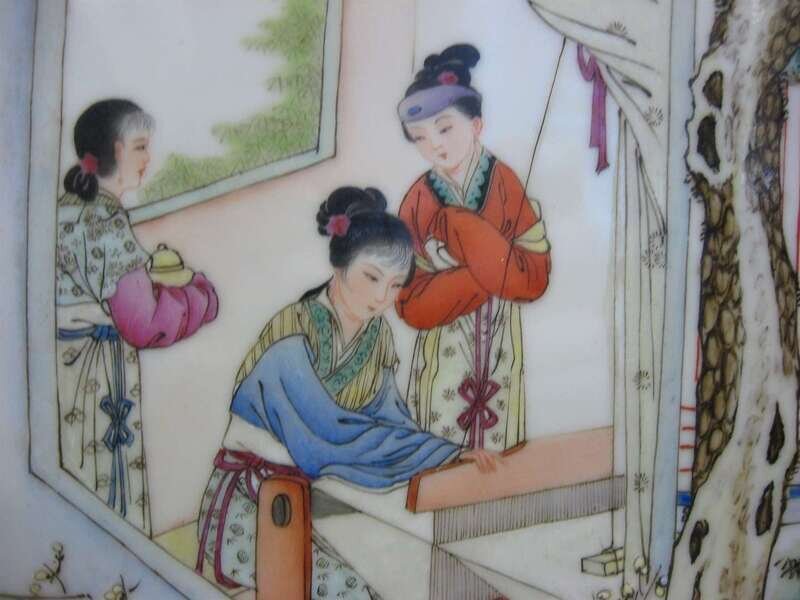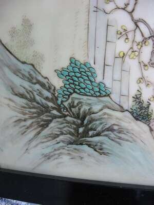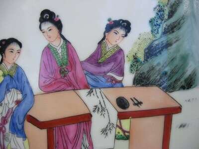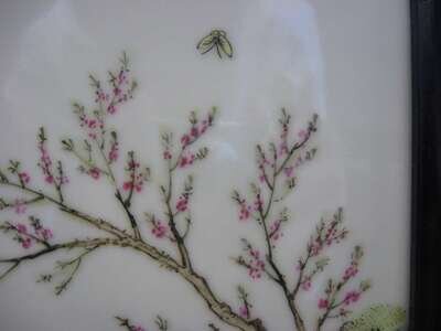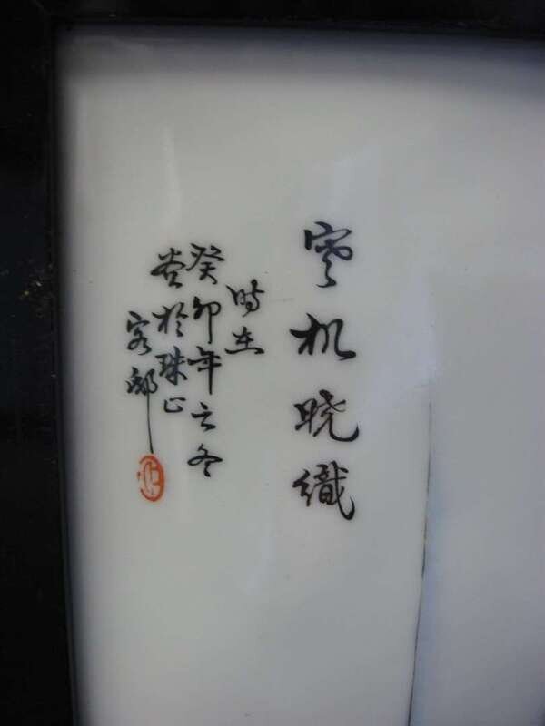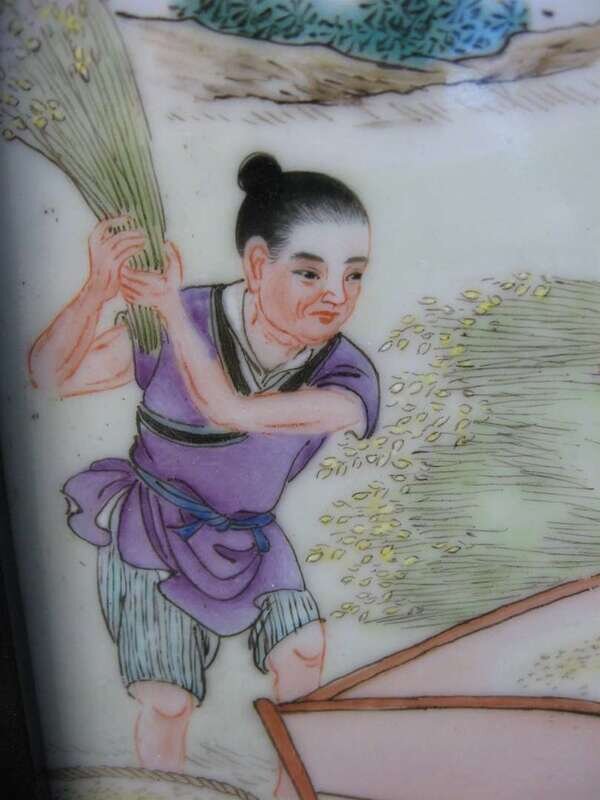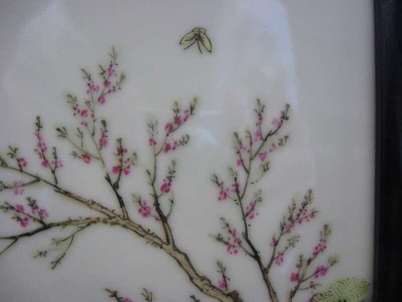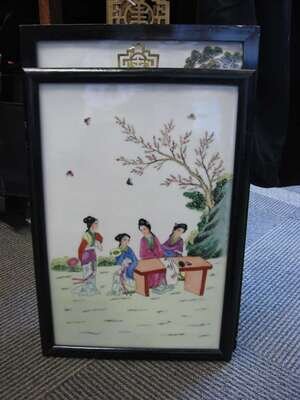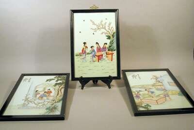 Comprised of a pair and smaller similar plaque all enameled to show figural landscapes, framed.