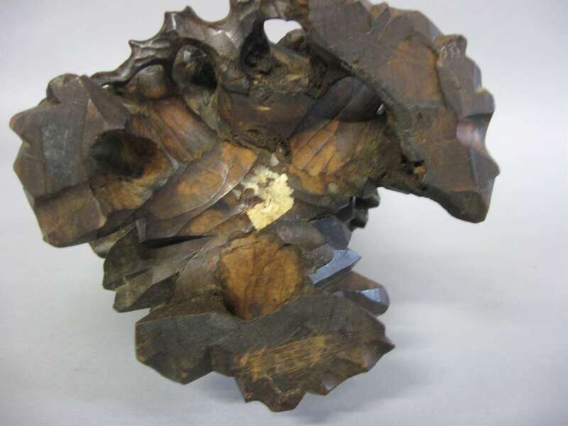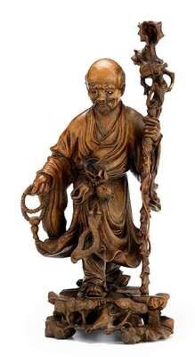 Well carved single section, to show standing scholar with staff over rock work.