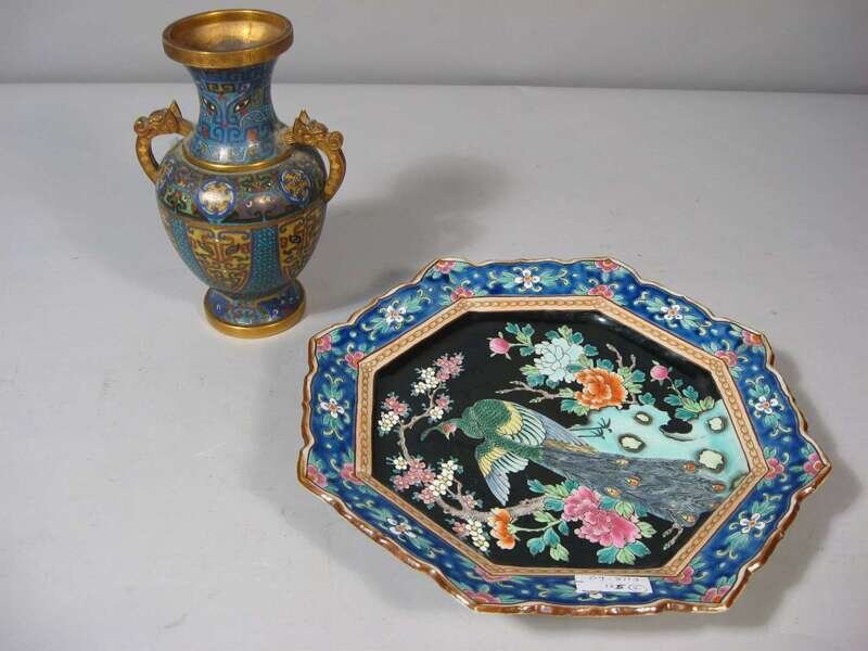 with foliate and pheasant decorations together with twin handled cloisonne vase.