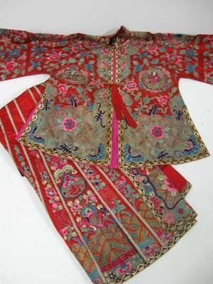 Brightly decorated matching garments with embroidered flowers, figural roundrels and metallic-thread embellishments; petite size.