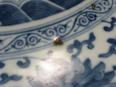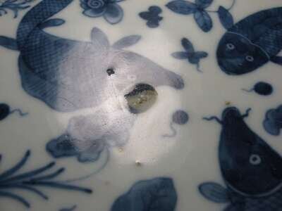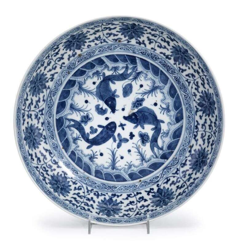 Of round, medium-deep form; decorated to interior with central aquatic medallion depicting three carp encircled by a wave band; with lotus-scroll decoration to interior and exterior sides; double ring to base.