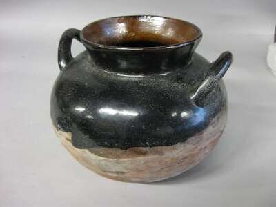 Of globular form, arched twin handles, glazed to below shoulder, buff body showing.