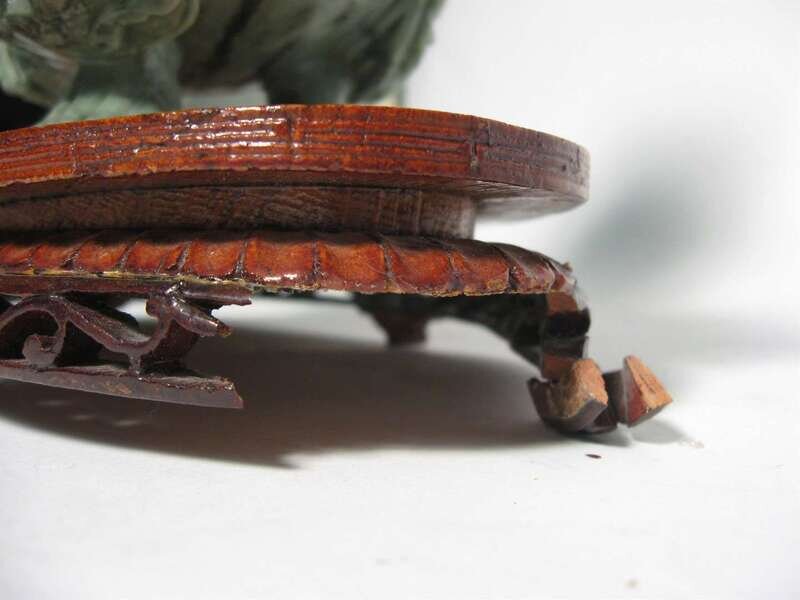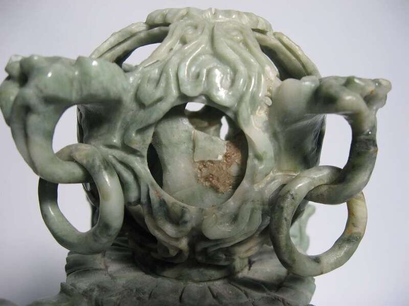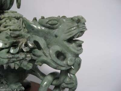 Having a carved " mystery ball " top above the base with twin ornate carved foo lion handles on a hardwood base.