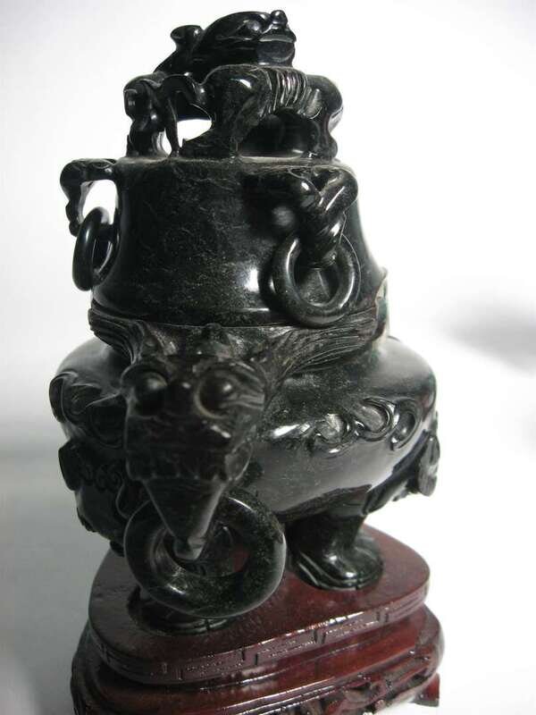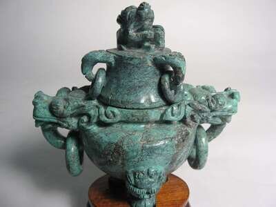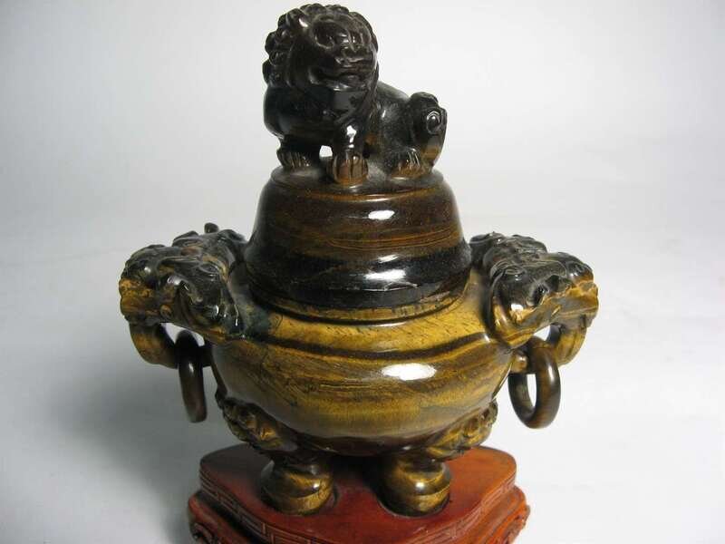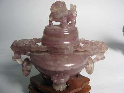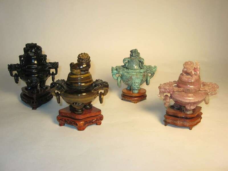 Rose quartz, goldstone, turquoise and hardstone. Various lids, all with ring handles, hardwood stands.