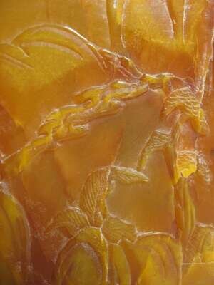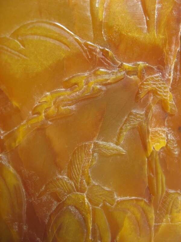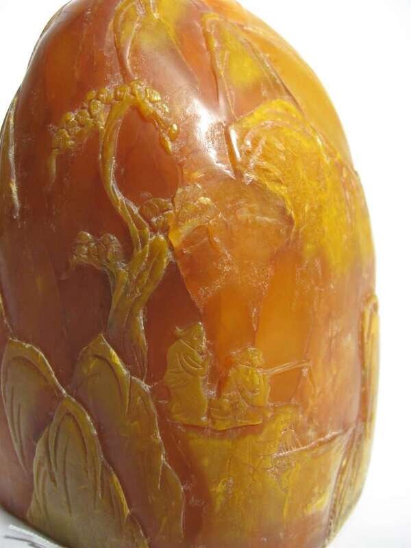 Of natural form, carved in light relief to display figures in mountainous setting.