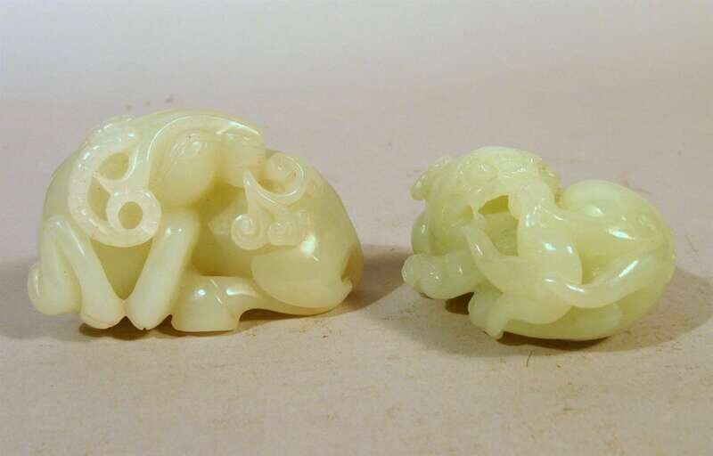 Both pieces carved to depict recumbent beasts: the first a ram exhaling a vaporous lingzhi and the second a fu lion exhaling a cloud; stone of celadon hue.