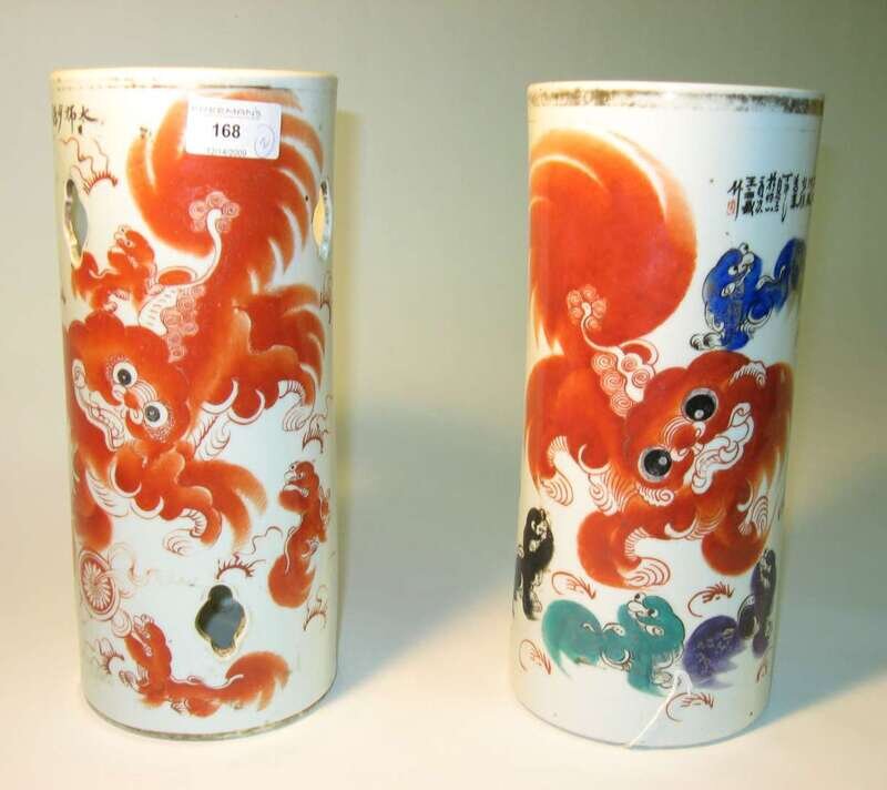 Of slightly concave cylindrical form; both inscribed and painted with playful images of fu lions; one stand with sparse openwork.