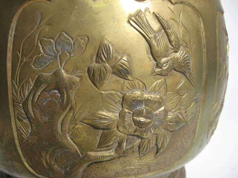 Four relief panels of exotic birds, elephant head handles.