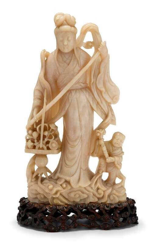 Well-carved openwork, somewhat-flattened depiction of standing female figure in flowing robes with a flower basket on carrying pole flanked by a youth with lingzhi fungus; affixed to carved openwork wooden base.