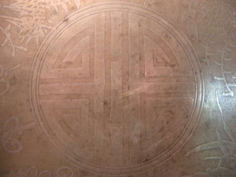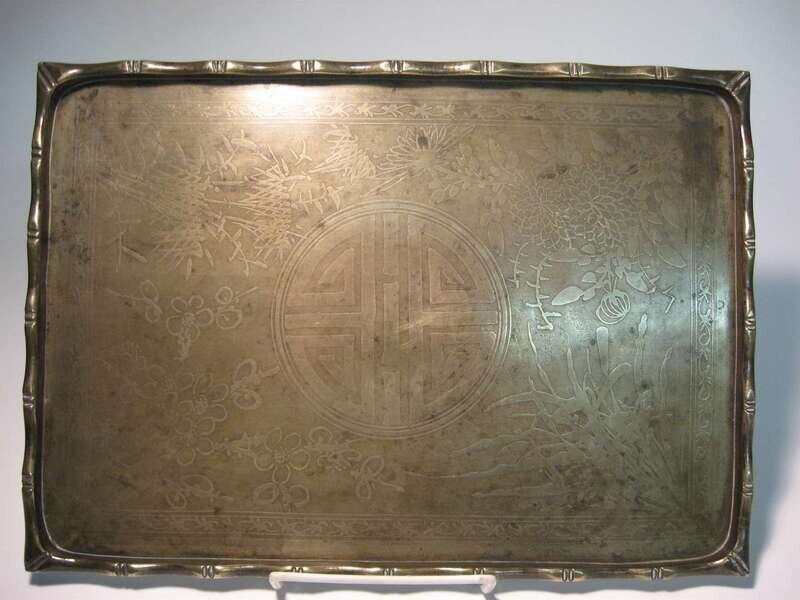 Rectangular tray with waved bamboo-form rim etched to interior with decorative band, floral embellishments and central shou medallion.