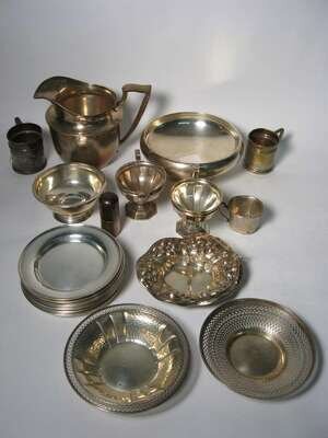Including twelve bread plates, water pitcher, circular sterling silver fruit bowl, repousse candy basket, creamer and sugar bowl, small bowl, two candy dishes, small circular container and three assorted sized cups, 24 pieces.