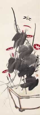 Morning glories and dragonfly, wash and ink on paper.