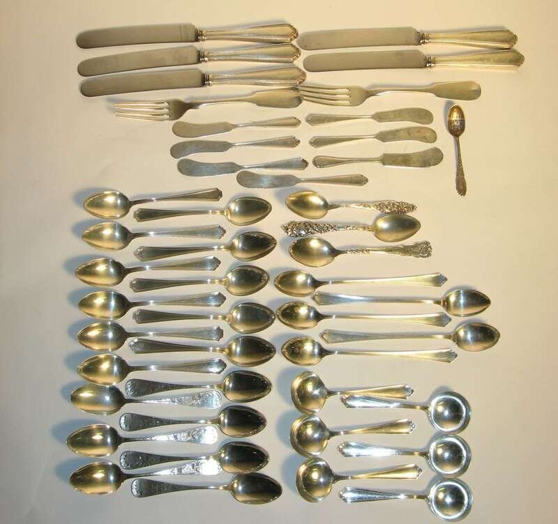Assorted patterns including place knives, bouillon spoons, teaspoons, flat butter spreaders and dinner forks, 46 pieces.