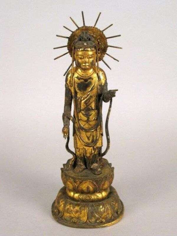 Graceful figure with guiding hand stands on double lotus base; with pearlescent bead nikkeishu, delicately-carved ribbons and detachable gilt aureole.