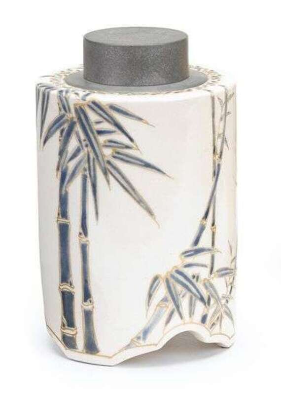 Of cylindrical form, gosu blue bamboo grove to sides, pewter cap.