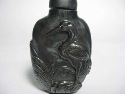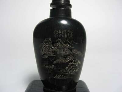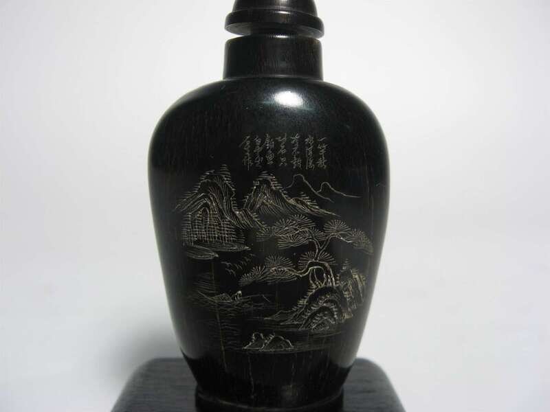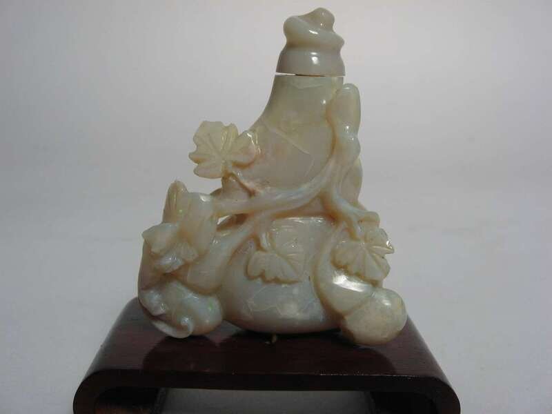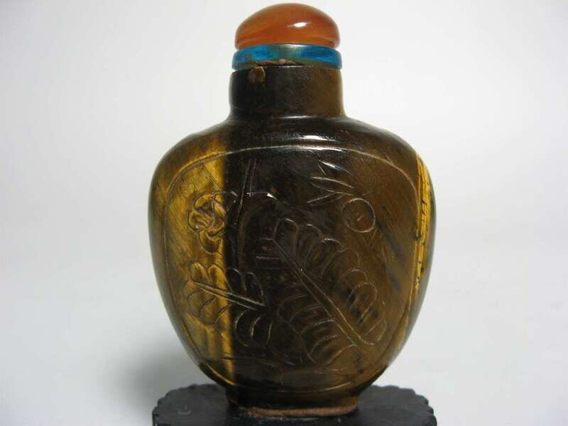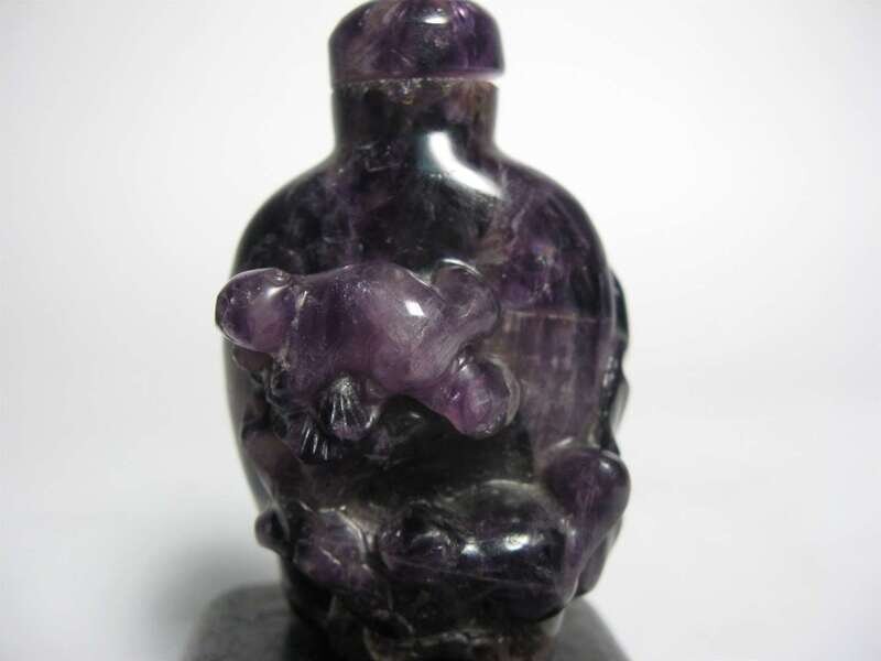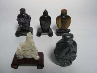 Including a hematite stone carved snuff, a tiger eye bottle on stand, a horn bottle with landscape scene, carved opal floral decorated bottle on stand and an amethyst quartz bottle on stand.