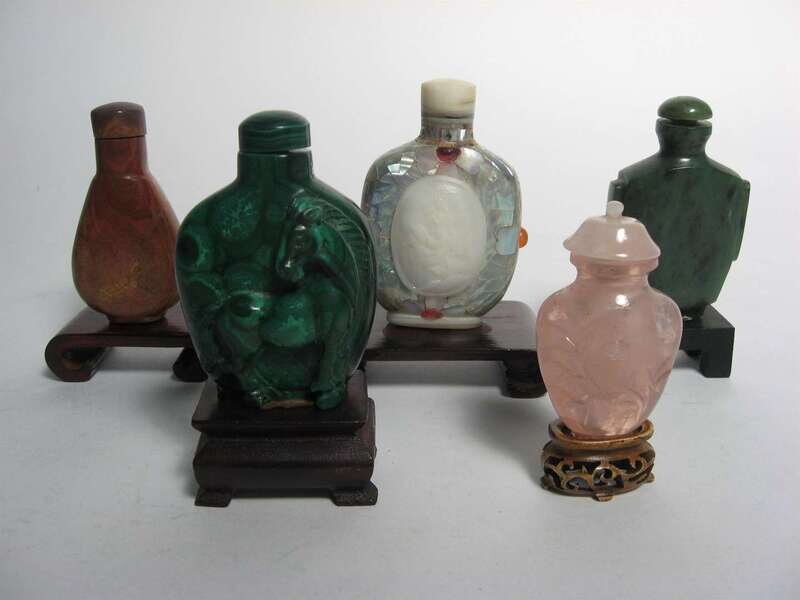 Including a malachite bottle on stand, a Art Deco style green quartz bottle on stand, a green and brown bottle on stand, a small pink rock crystal snuff on stand and a carved mother of pearl bottle on stand.