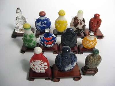With a lapis bottle, a rock crystal figure of an immortal, red marble snuff bottle, 6 Peking style glass bottles, a blue adventurine, yellow net and " spinach " jade snuff bottle.