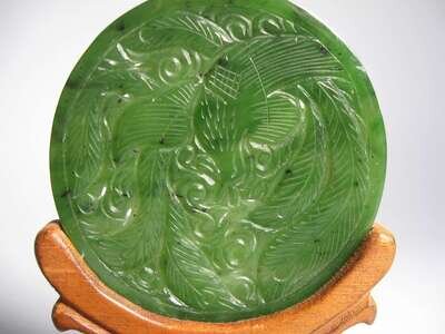 Face incised carved with a bird in leaves, the reverse incised carved with a dragon; carved wood stand.
