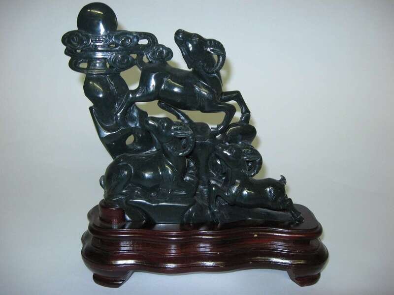 Green stone grouping of three rams on rocky crag below a hazy sun; with fitted wooden stand.