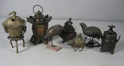 Six Japanese and Chinese bronze censers, and Meiji okimono